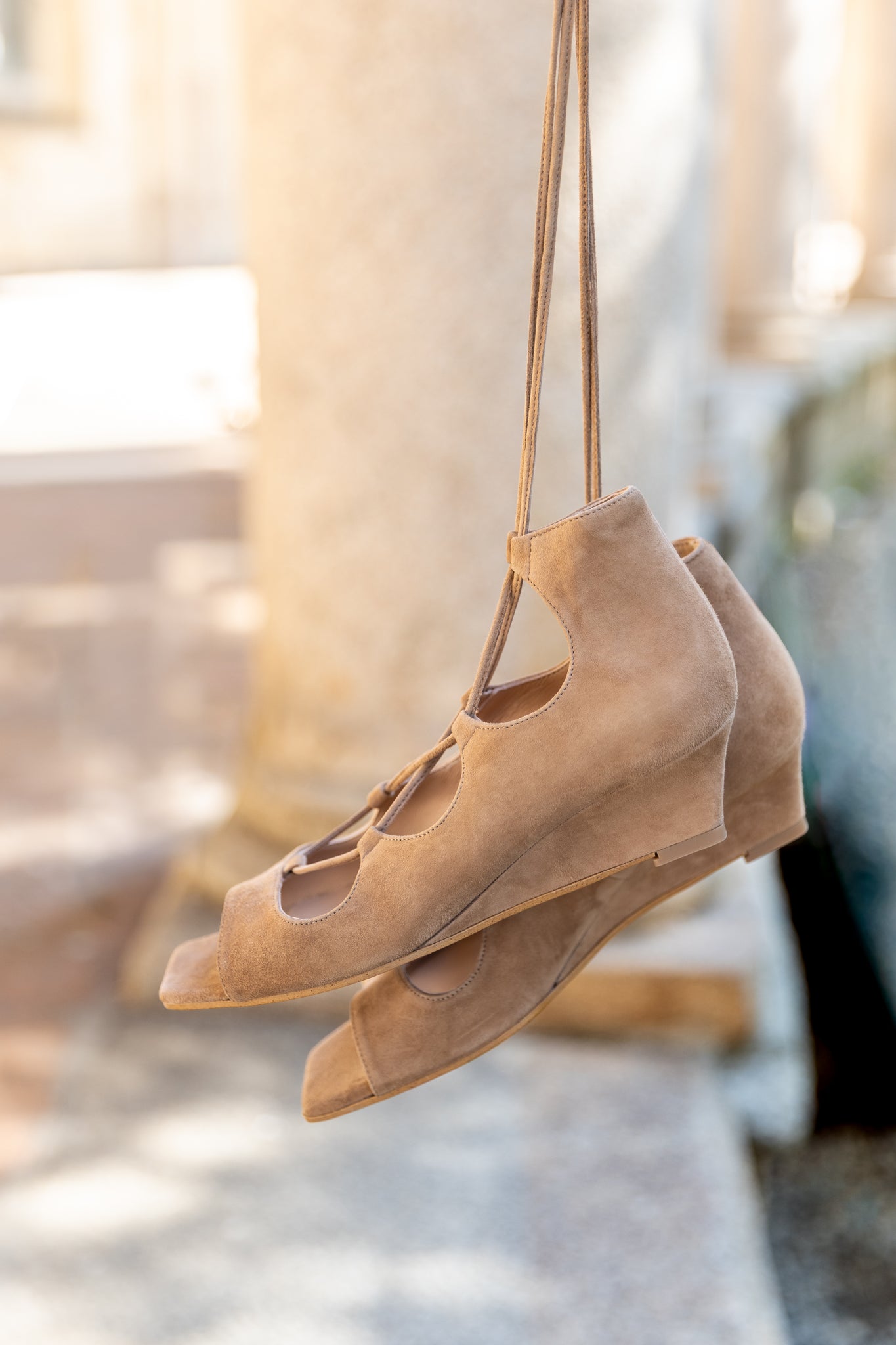 Sandalo iconico in suede biscotto con punta squadrata e laccetti in tinta. Comodissimo tacco zeppa svasato di 4 cm e suola in sottile gommina antiscivolo. Interamente foderata in pelle naturale. Lavorata artigianalmente in Italia.