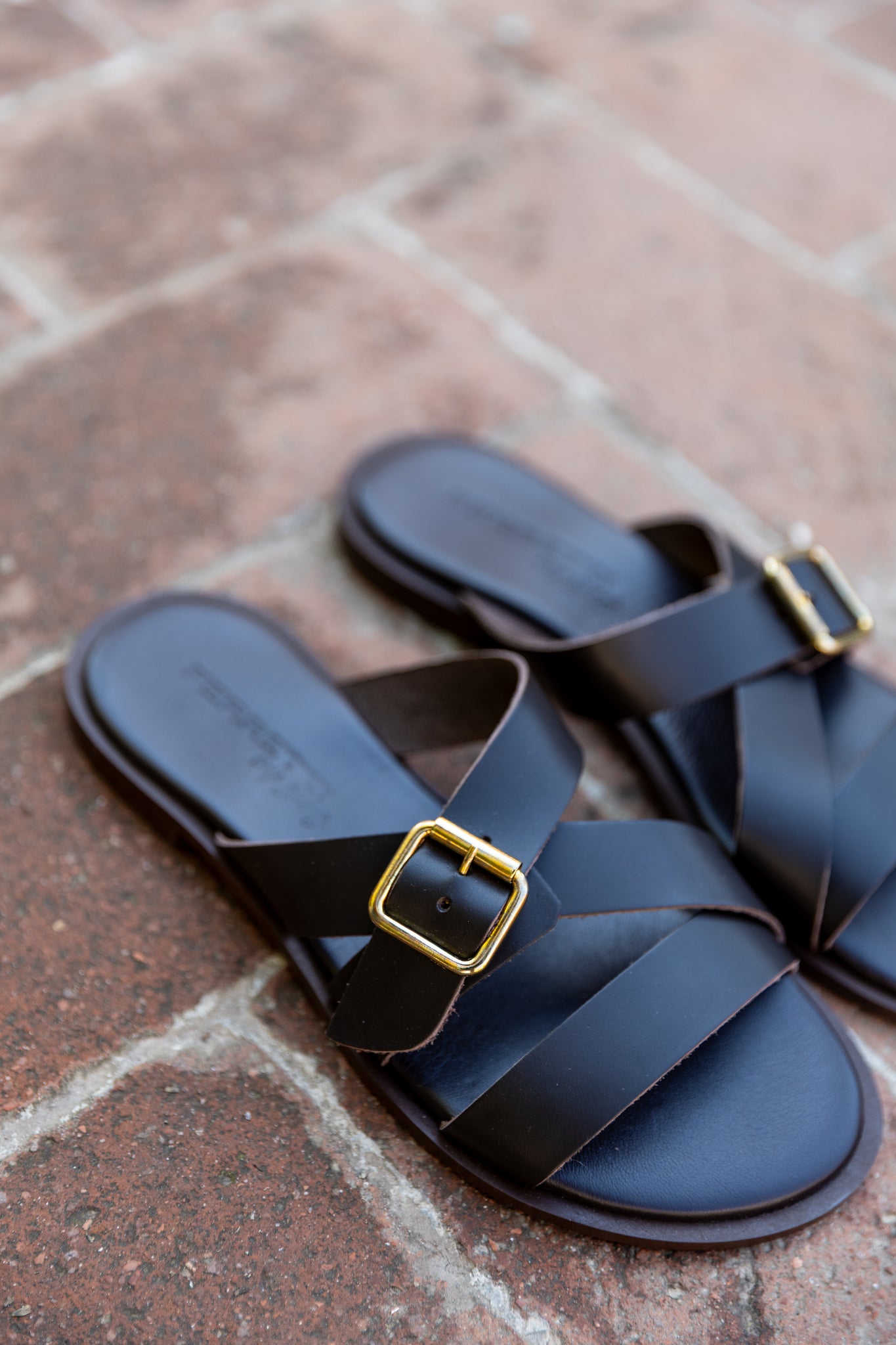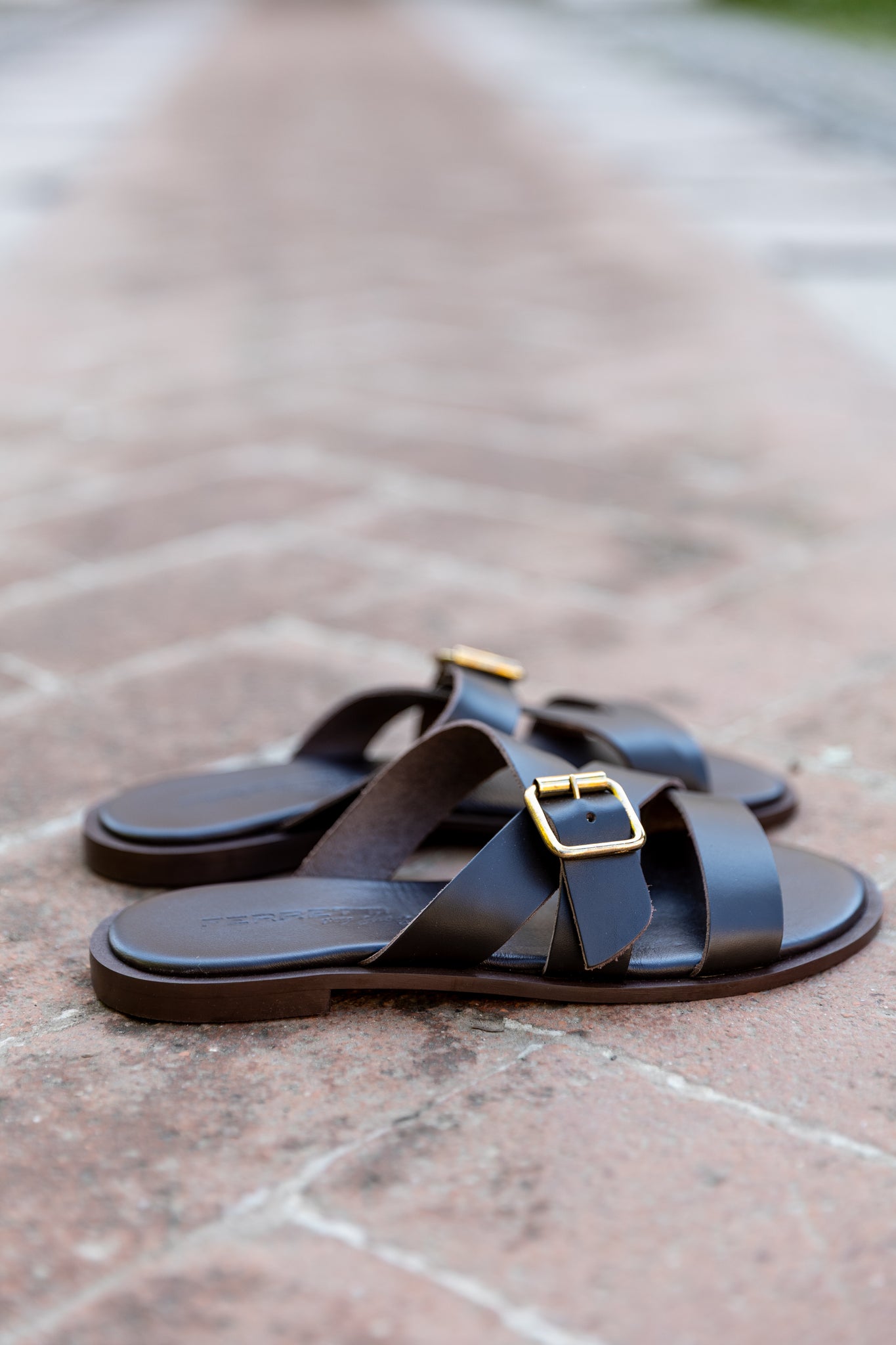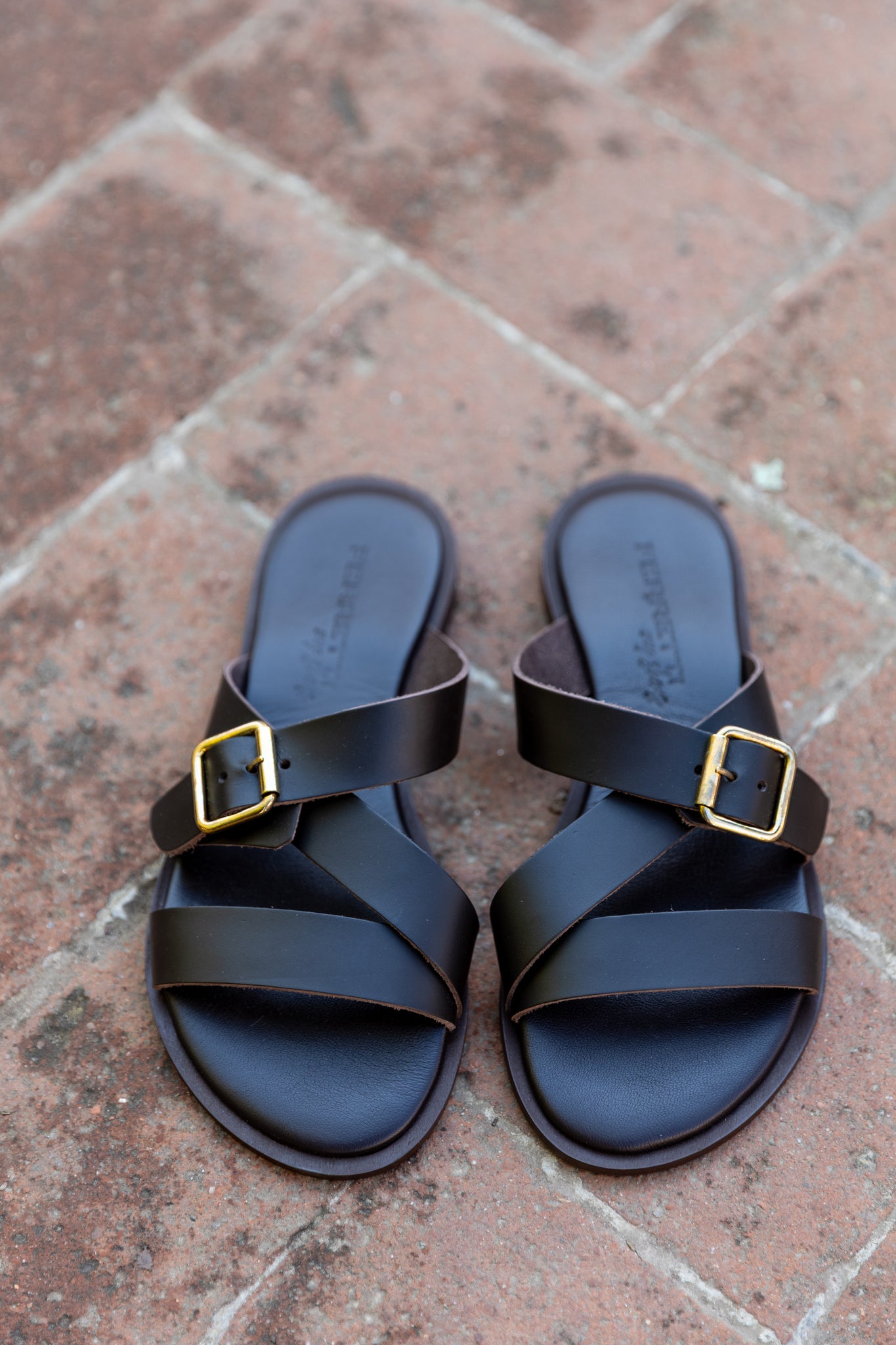 Sandalo a fascia incrociata in pelle testa di moro con fibbia dorata laterale. Ha una soletta in pelle imbottita super comfy e il fondo in vero cuoio con inserto in gommina antiscivolo. Realizzato artigianalmente in Italia.