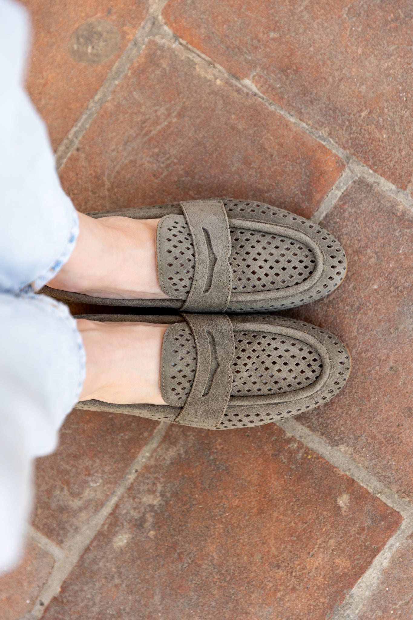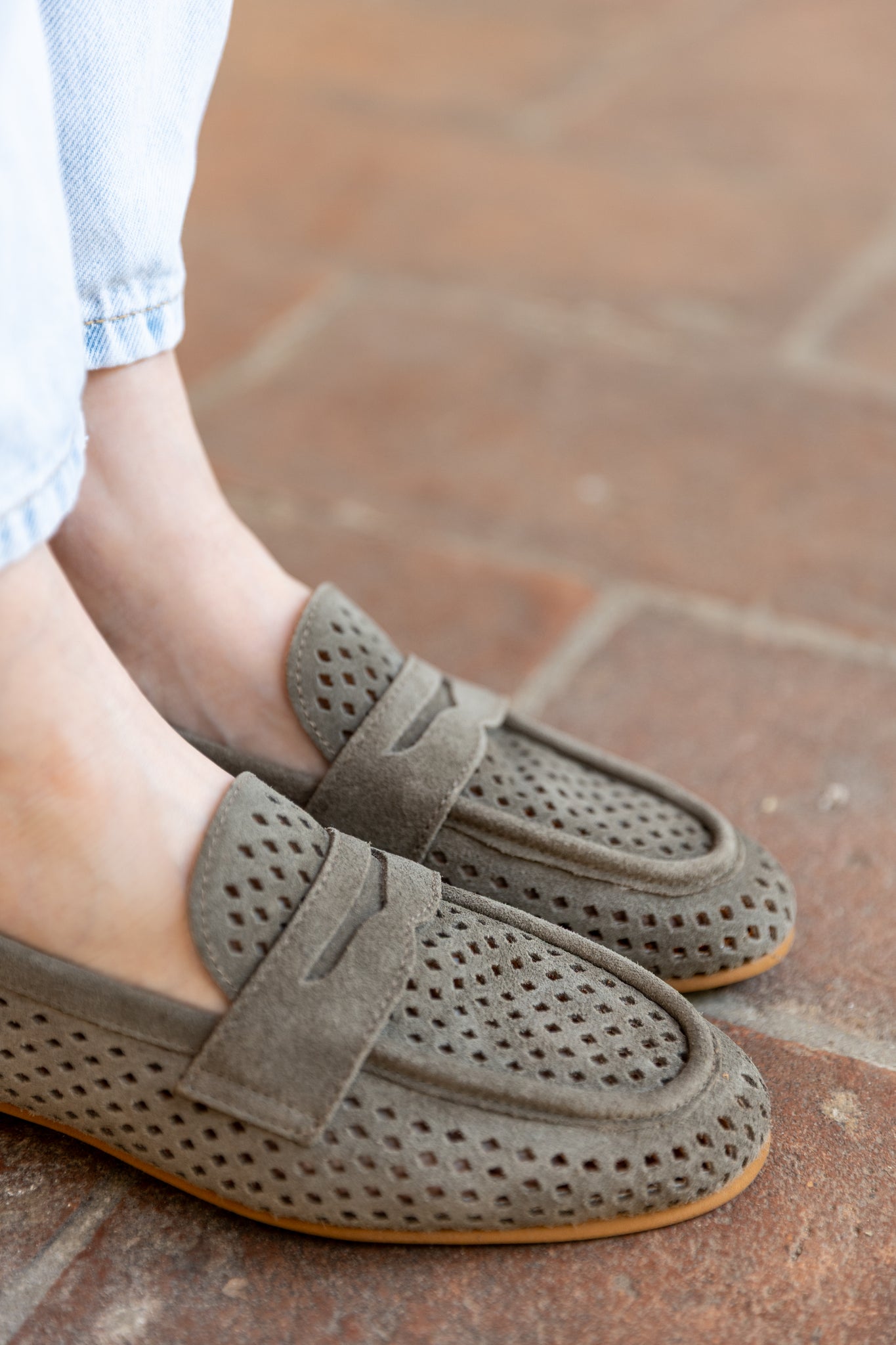 Penny loafer in suede traforato color militare con traversino a bocca di leone. Foderato in morbida pelle e totalmente traspirante grazie alla foratura che riveste l’intera tomaia. Ha un comodo tacco di circa 2 cm e una sottile gommina antiscivolo.
