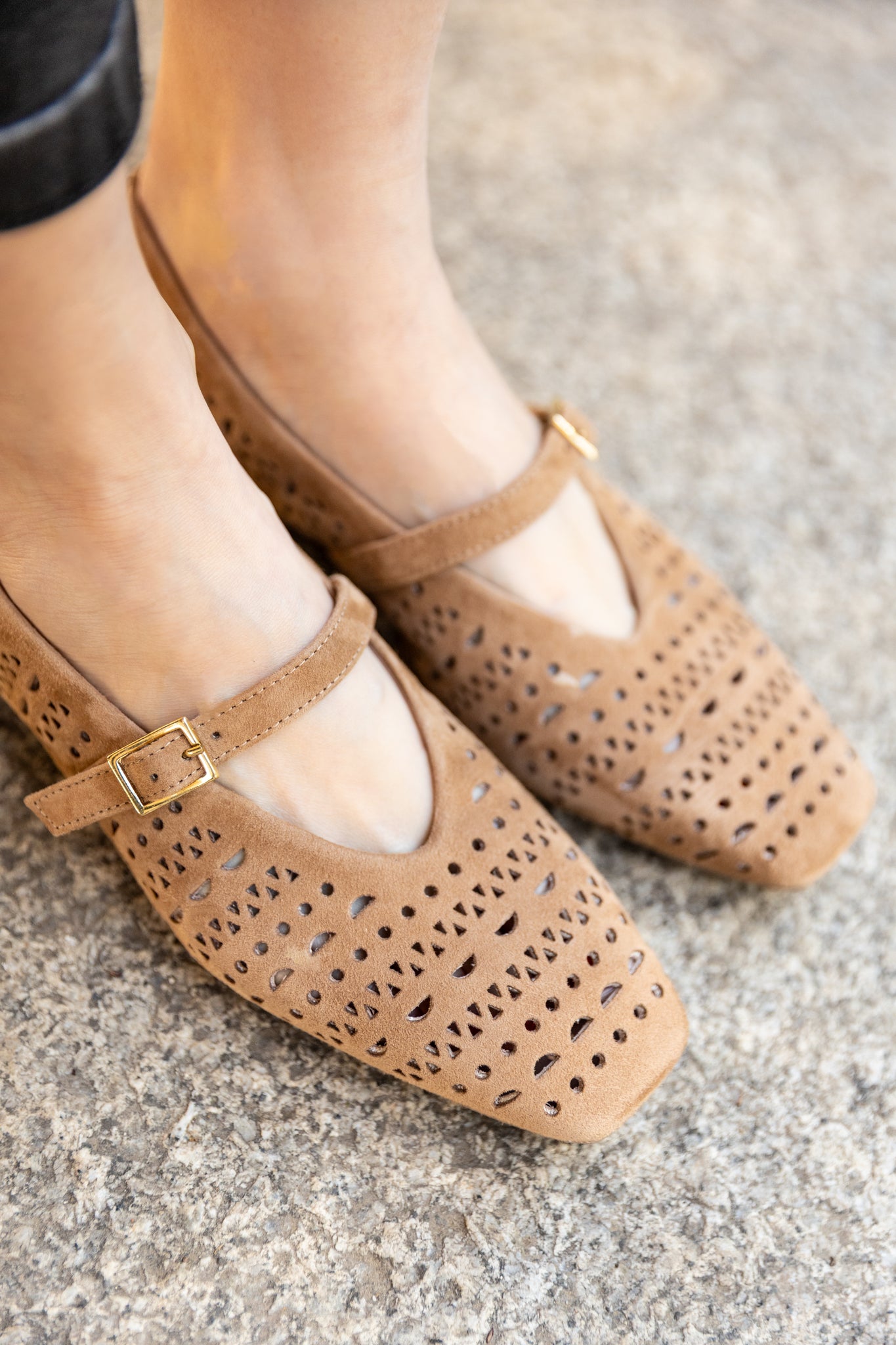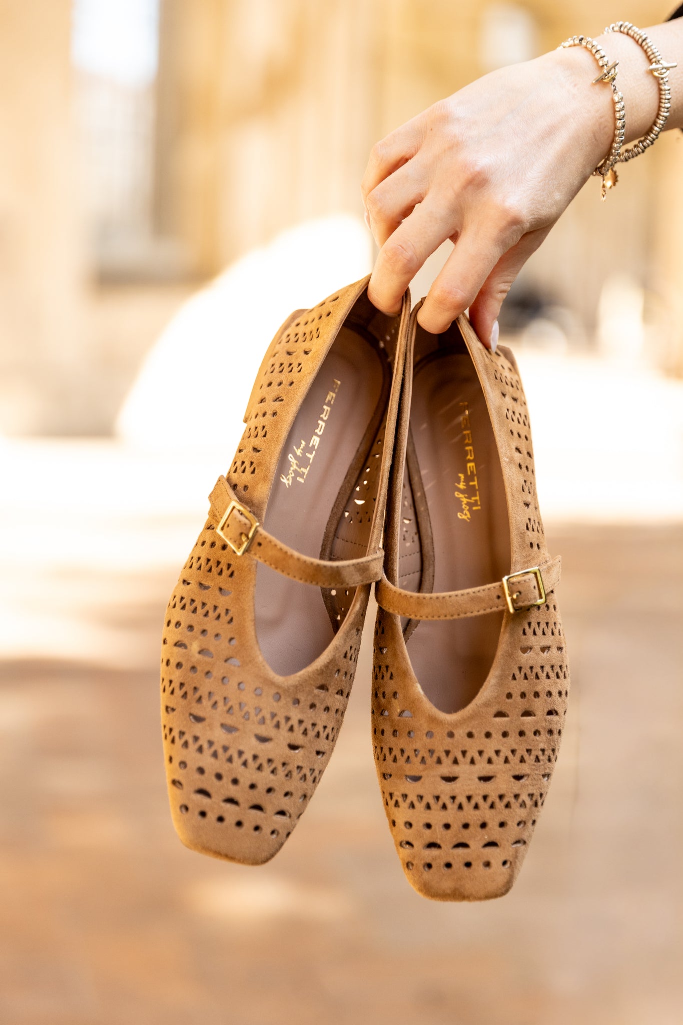 Ballerina di forma leggermente quadra con scollo a mandorla realizzata in morbido suede traforato color biscotto. La suola è in gommina antiscivolo ed è totalmente foderata in morbida pelle . Ha un comodo tacco di 2 cm squadrato che segue la linea ed è completamente realizzata in Italia da abili artigiani.