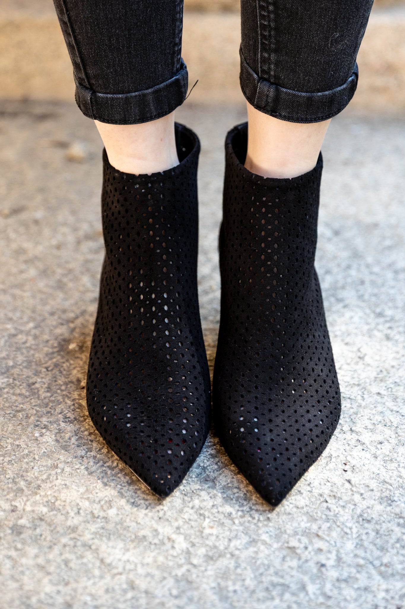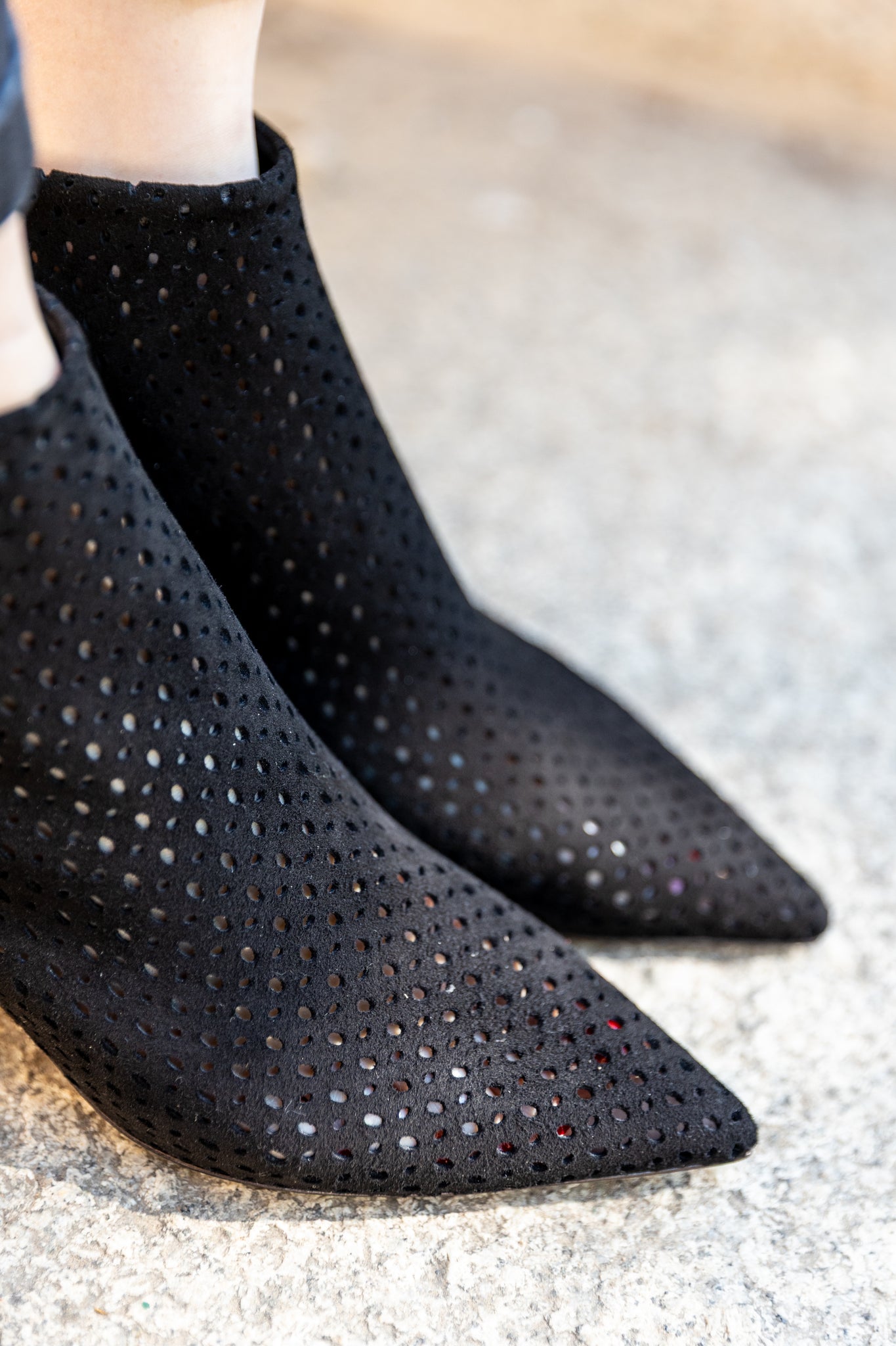 Iconico ankle boot in morbidissimo suede nero traforato con un tacco svasato e ricoperto in pelle di circa 5 cm.