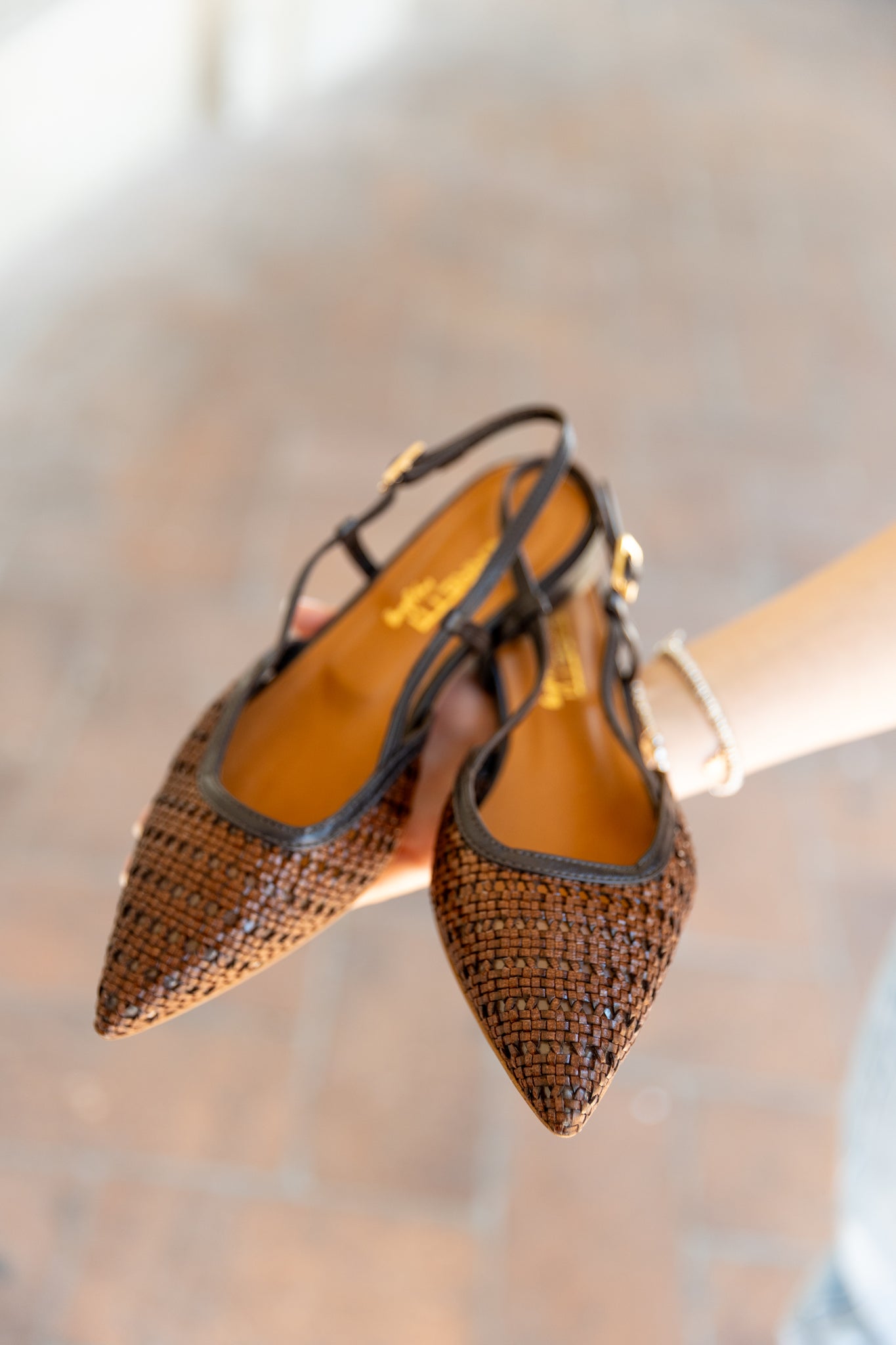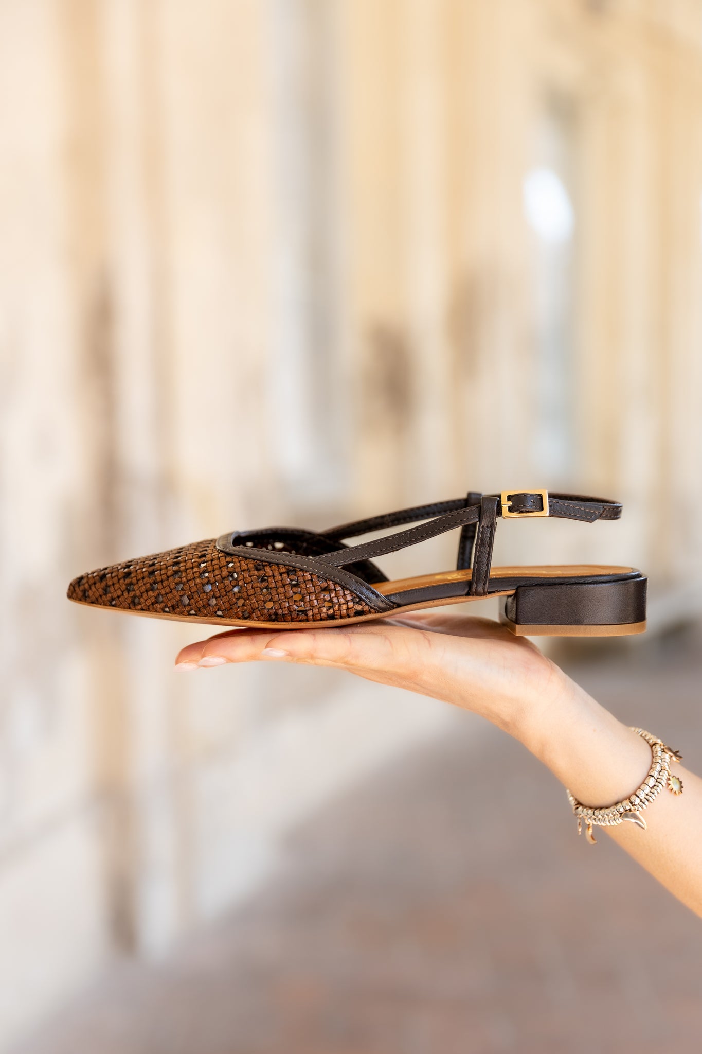 Slingback di forma sfilata in pelle intrecciata color caffè profilata con cinturino regolabile. Ha un comodo tacco di quasi 3 cm e una suola in leggera gommina antiscivolo. La traforatura rende il modello leggero e versatile indossabile anche nei periodi più caldi.