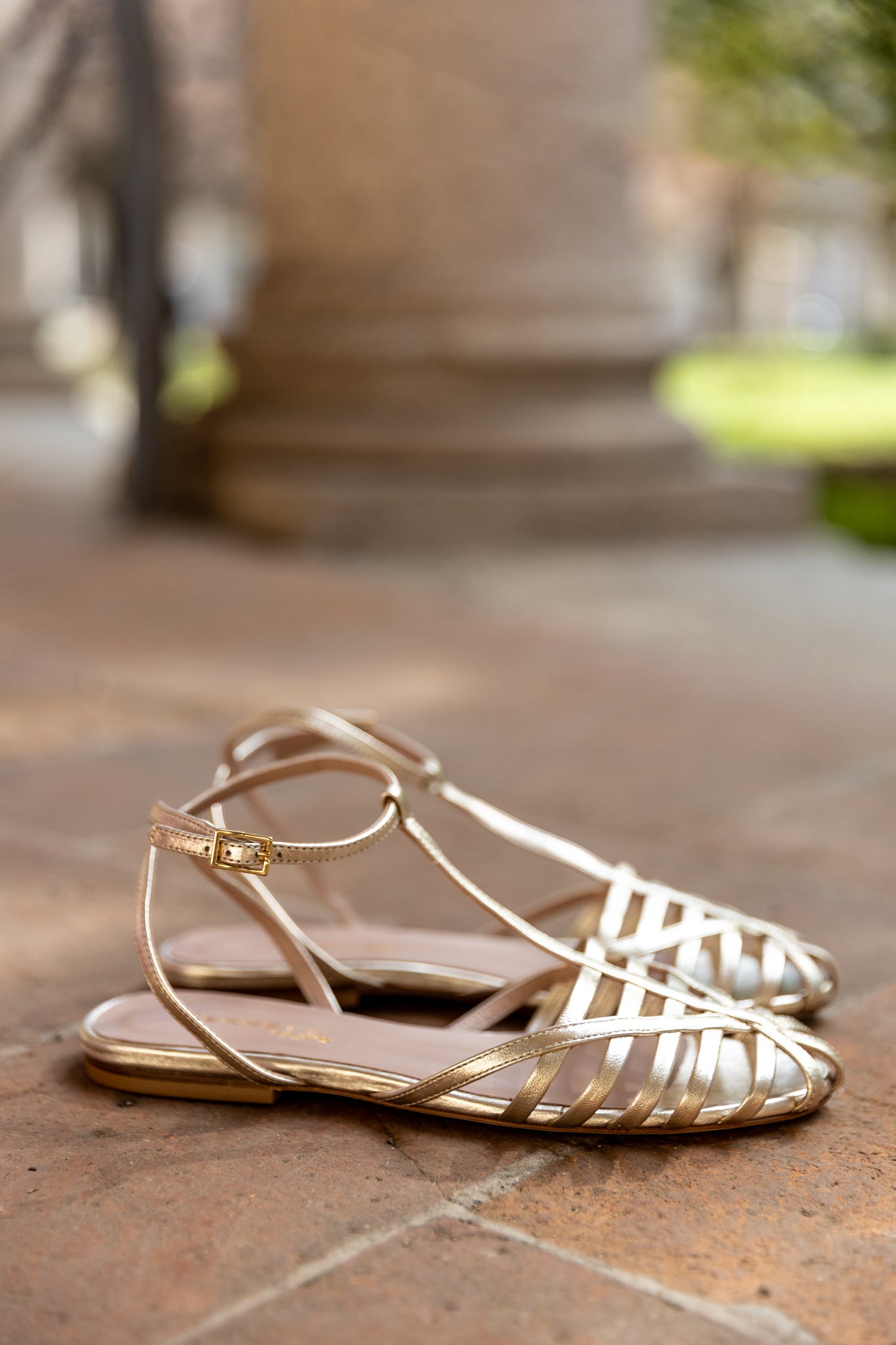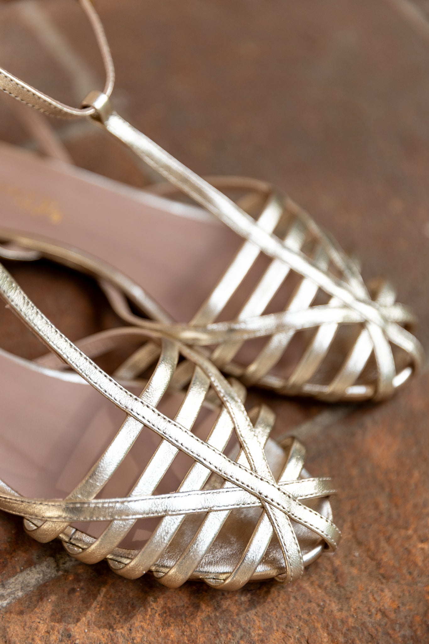 Sandalo a listini in pelle laminata color platino con t-bar e cinturino alla caviglia regolabile . La suola è in vero cuoio ed è realizzato in Italia da abili artigiani. Soletta interna in pelle.