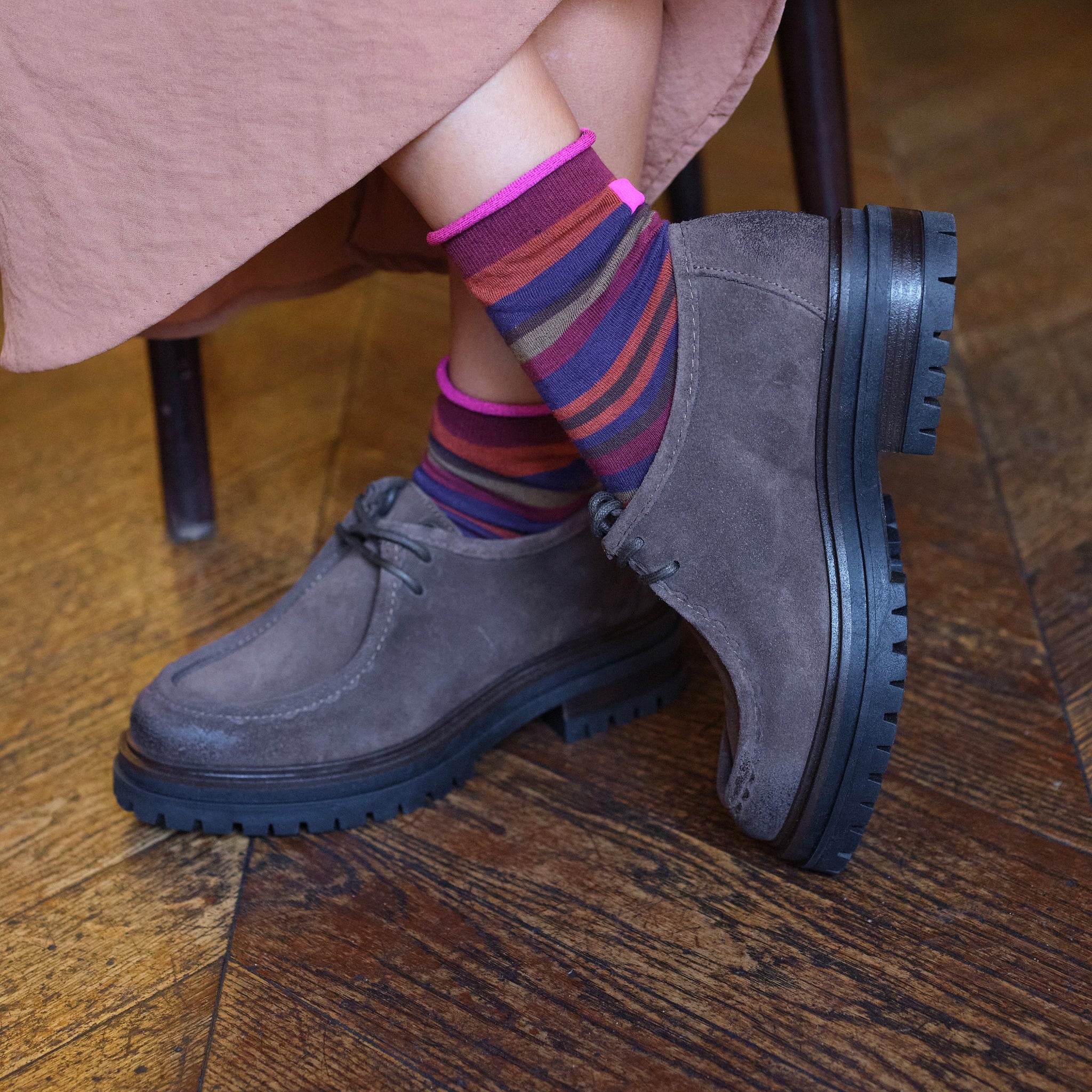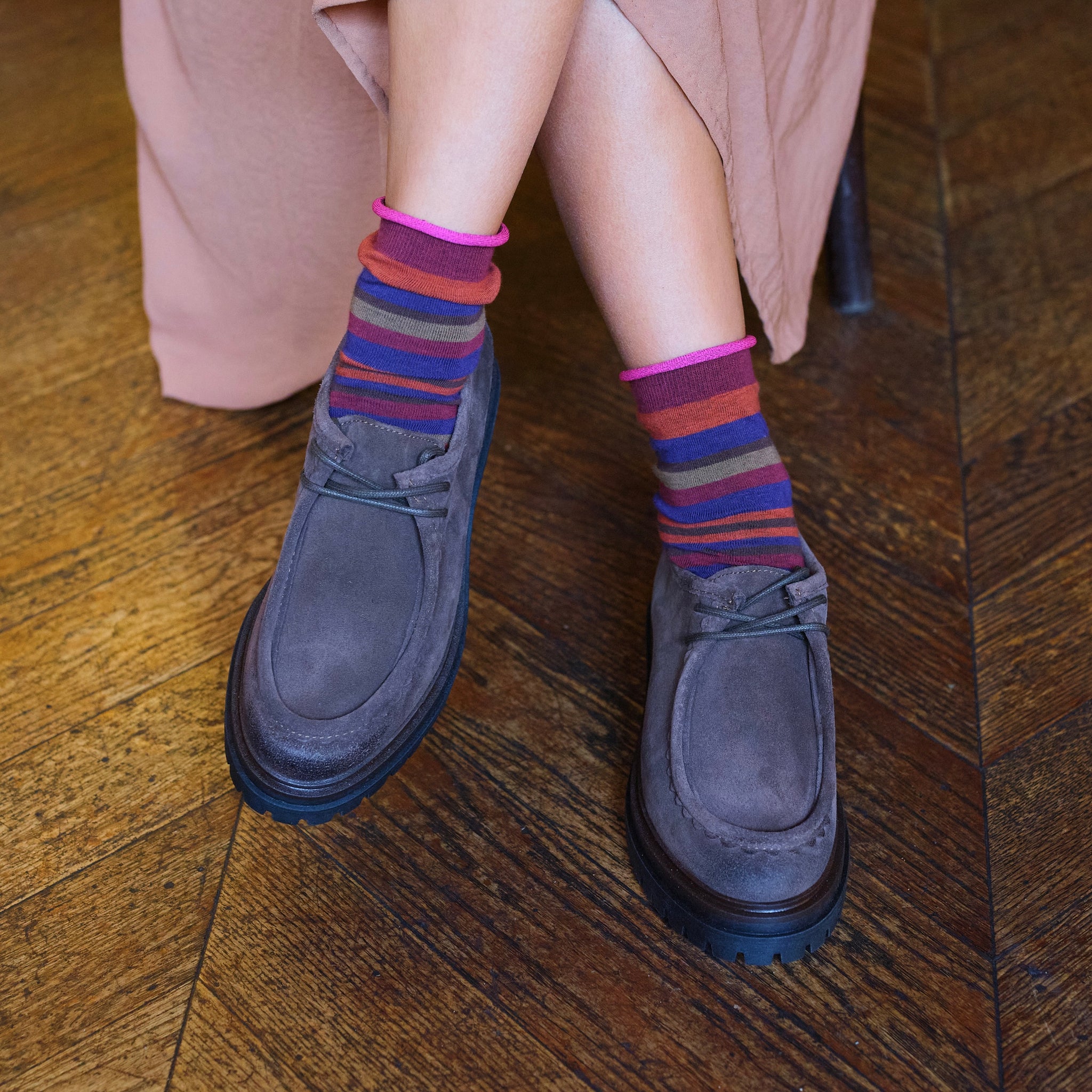 Paraboot in scamosciato testa di moro oppure in pelle nera allacciata con suola carrarmato di 2 cm e mezzo e tacco di 4. Completamente lavorata artigianalmente in Italia. Un evergreen che non subisce il tempo e la moda da 70 anni.