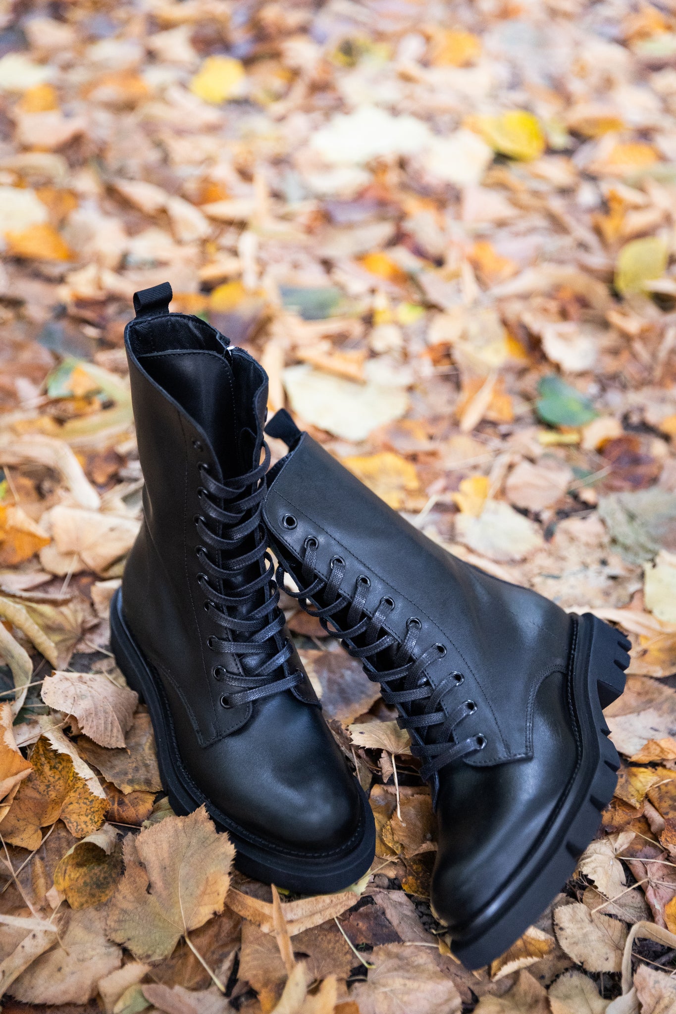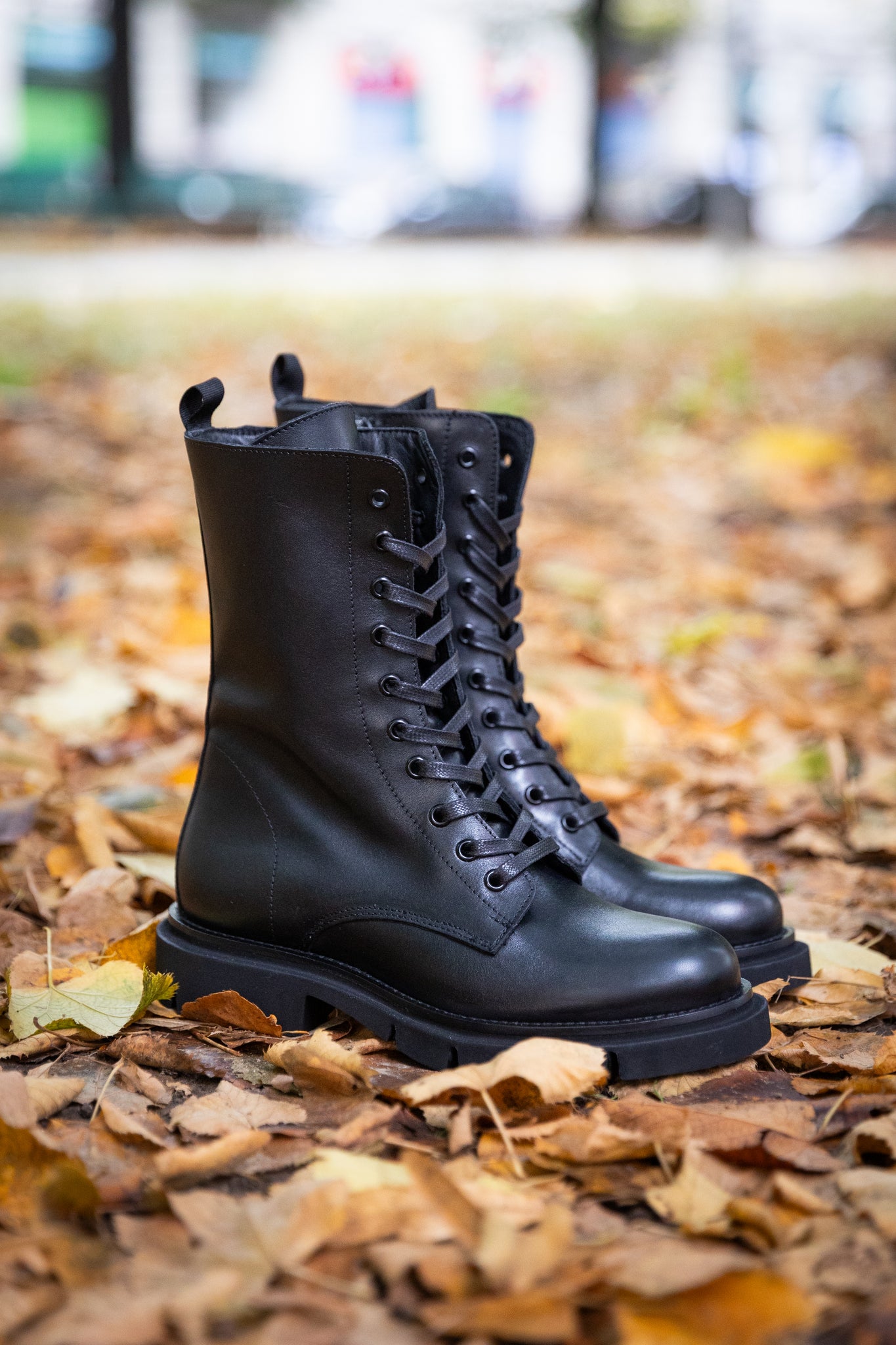 Anfibio in pelle nera con 10 passanti e zip interna per una veloce e comoda calzata. Ha un fondo extra light in gomma ed è completamente foderato in pelle. La suola è alta circa 2 cm e il tacco 4 cm. L'altezza del gambale è di 21 cm ed è lavorato artigianalmente in Italia. Per chi non vuole rinunciare alla grinta e alla comodità.