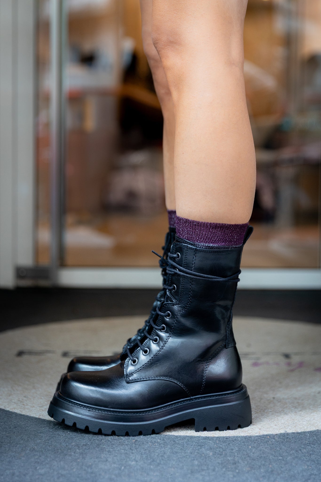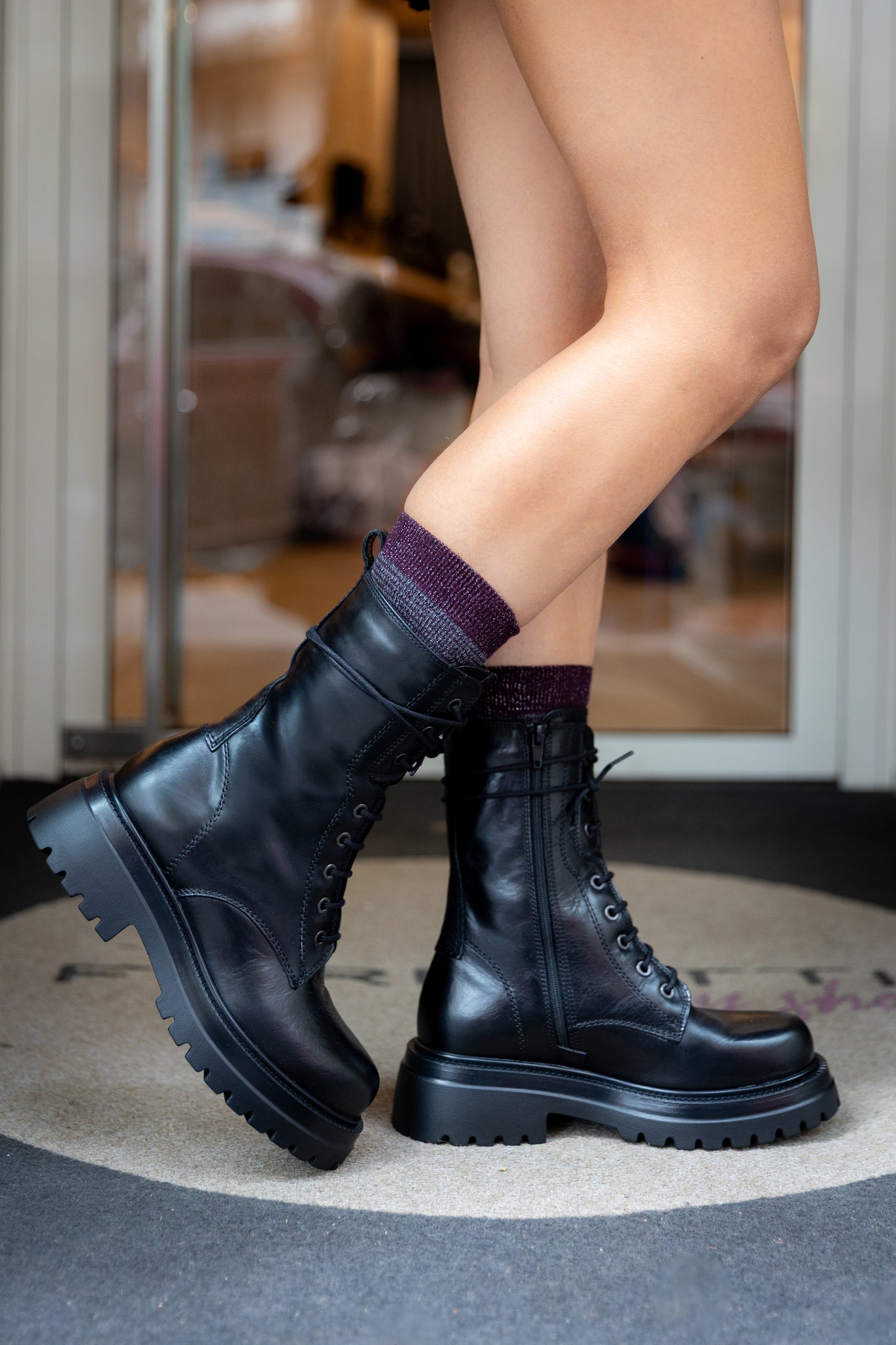 Anfibio in pelle abrasivata nera con 8 passanti e zip interna alla caviglia. Ha un tacco di 5 cm e una suola di 3.L'altezza interna della gamba è di 21 cm. L'allacciatura è completamente regolabile e il fondo è in gomma. Il rivestimento interno è in morbida e calda microfibra. Per chi non vuole rinunciare alla propria anima rock.