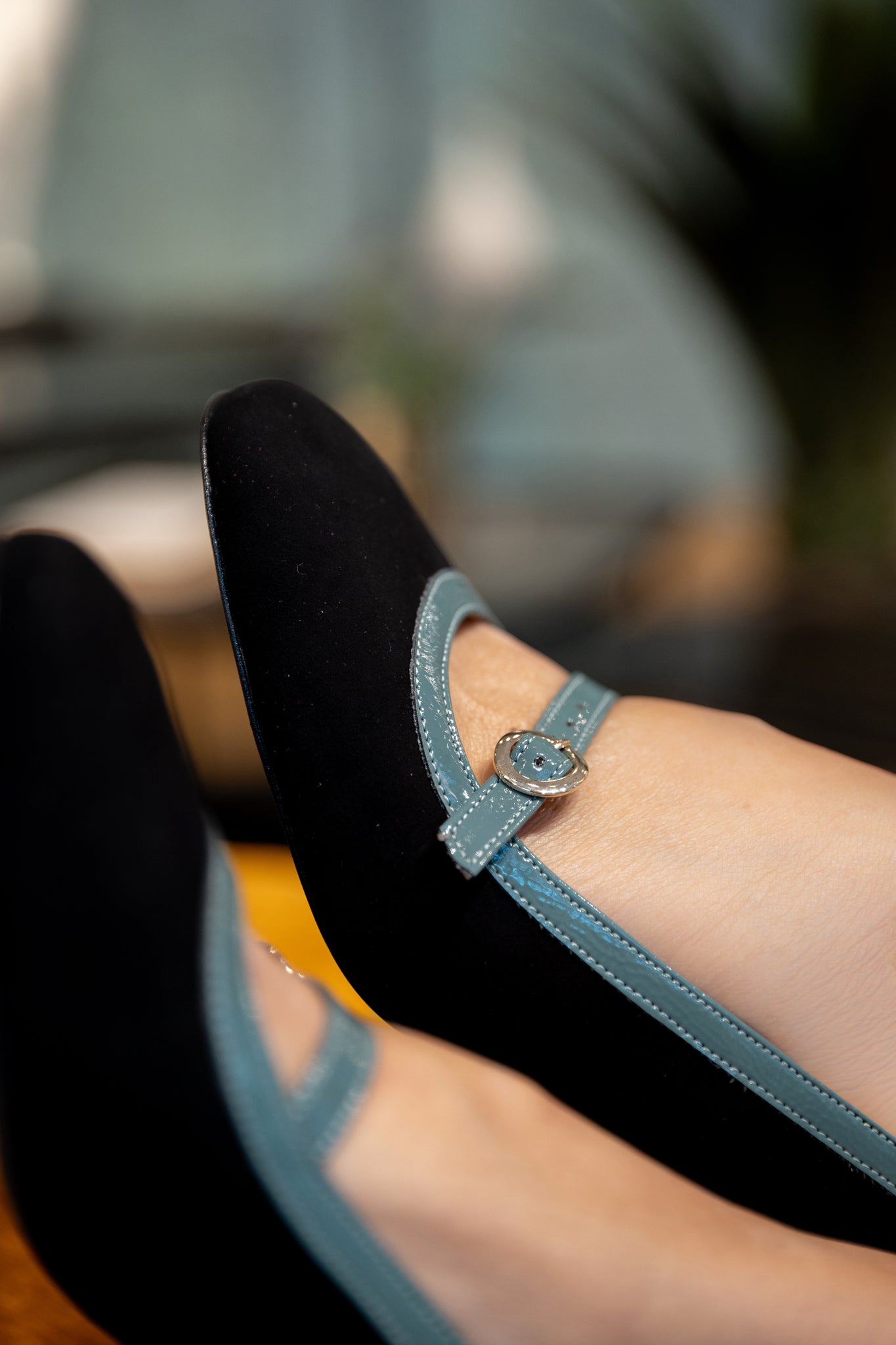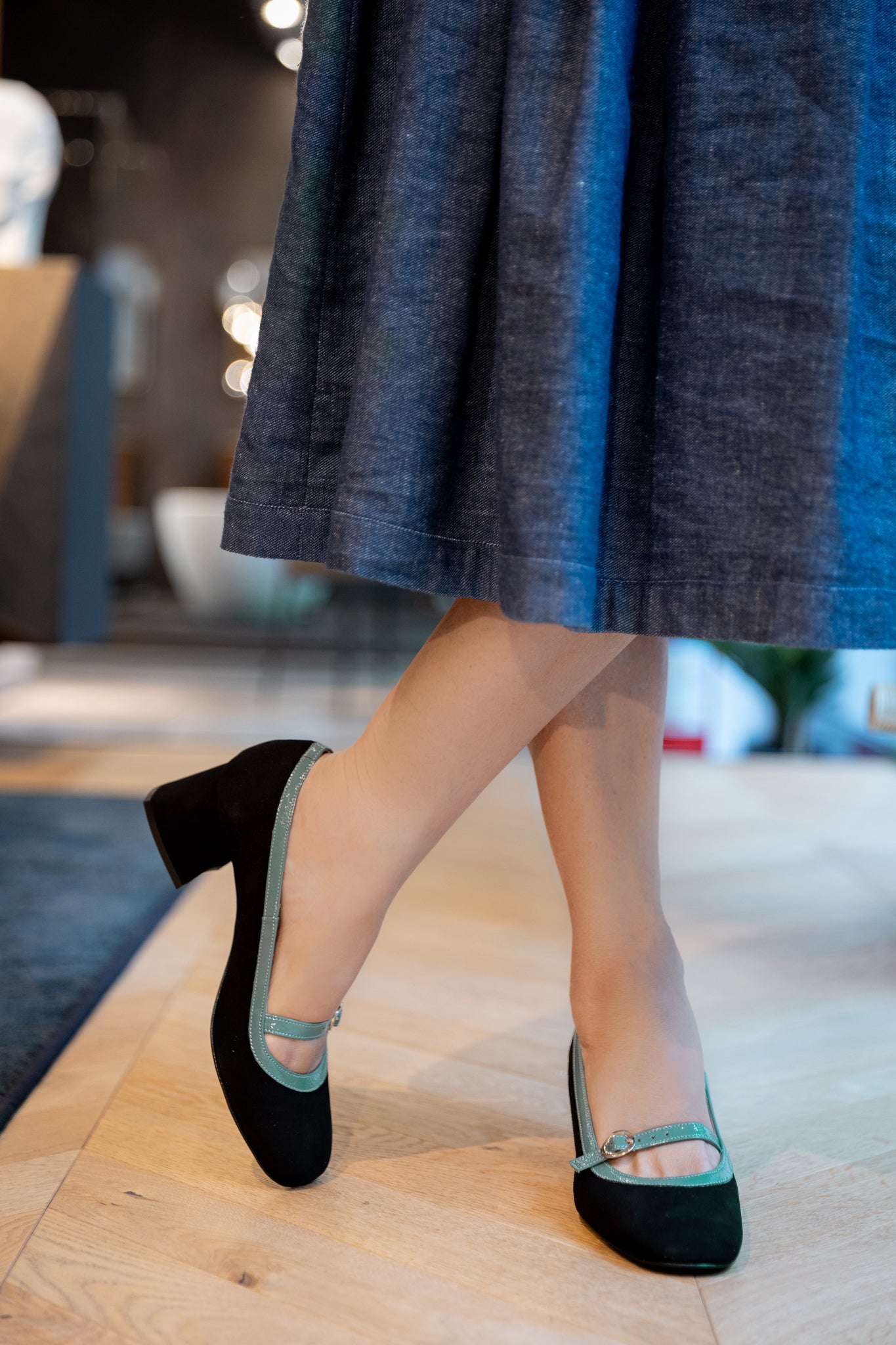 Mary jane in scamosciato nero con cinturino basso sul collo del piede e profilatura in vernice color salvia. Ha un comodo tacco largo di 5 cm ed e completamente foderata in pelle. Suola in gomma.