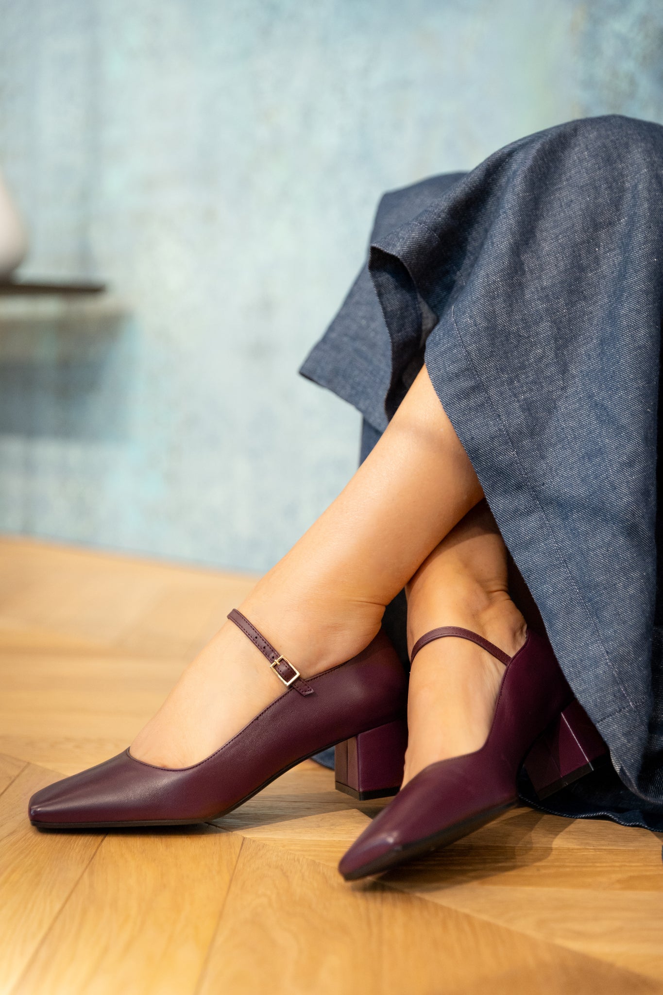 Mary jane in pelle bordeaux dalla forma squadrata con un comodo tacco largo di 4,5 cm.  È completamente foderata in pelle con suola in gomma. È lavorata artigianalmente in Italia ed è perfetta per completare un outfit da ufficio ma anche per dare un tocco bon ton ai vostri outfit serali o da tempo libero.