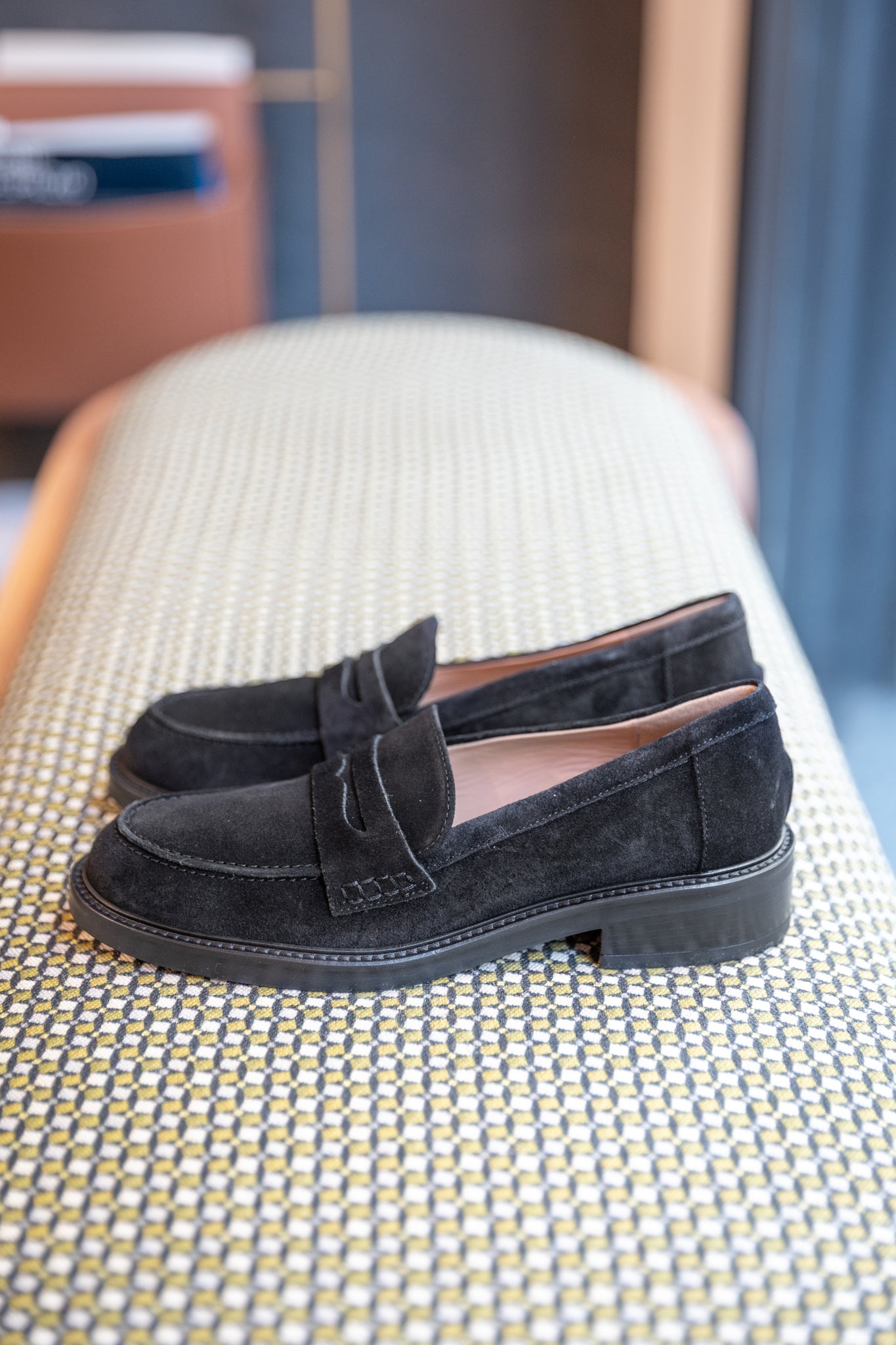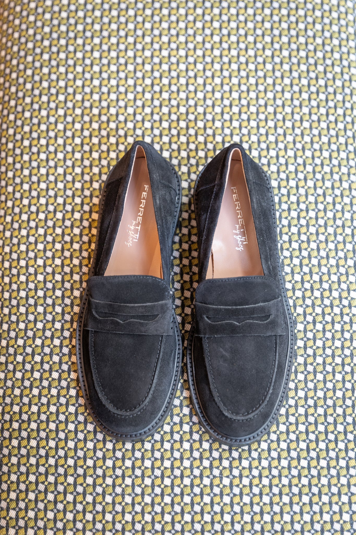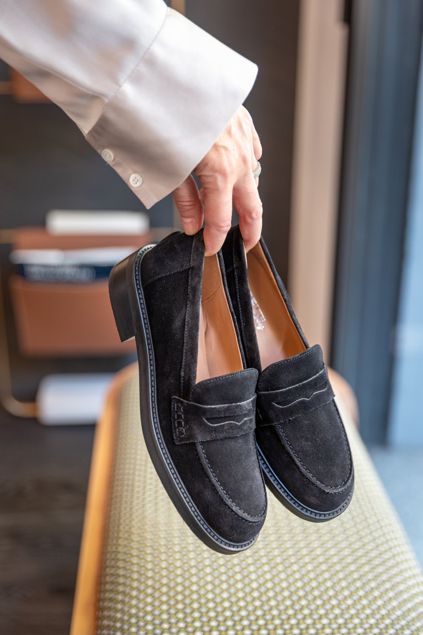 Classico mocassino “penny loafer” in suede nero di forma stondata con suola in gomma. Il tacco ha un’altezza di 3,5 cm e la suola di 1 cm.Interamente foderato in pelle e lavorato artigianalmente in Italia.
