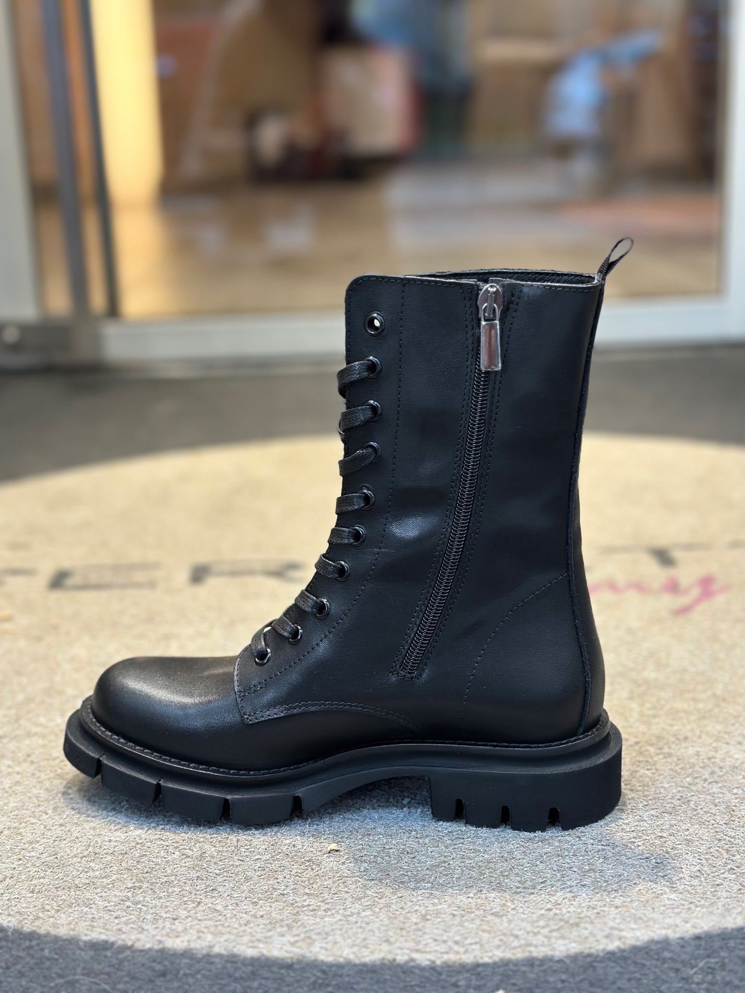 Anfibio in pelle nera con 10 passanti e zip interna per una veloce e comoda calzata. Ha un fondo extra light in gomma ed è completamente foderato in pelle. La suola è alta circa 2 cm e il tacco 4 cm. L'altezza del gambale è di 21 cm ed è lavorato artigianalmente in Italia. Per chi non vuole rinunciare alla grinta e alla comodità.