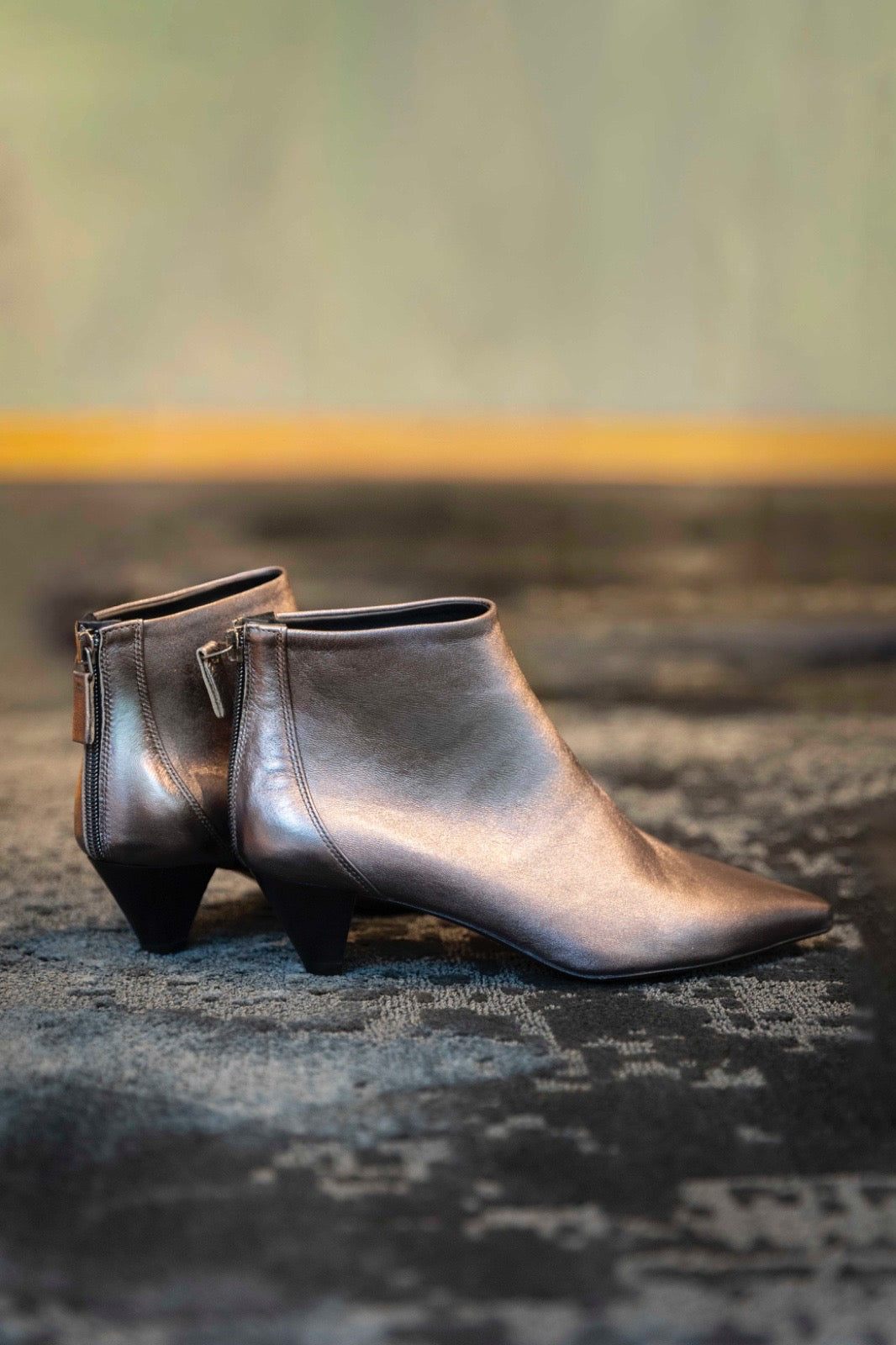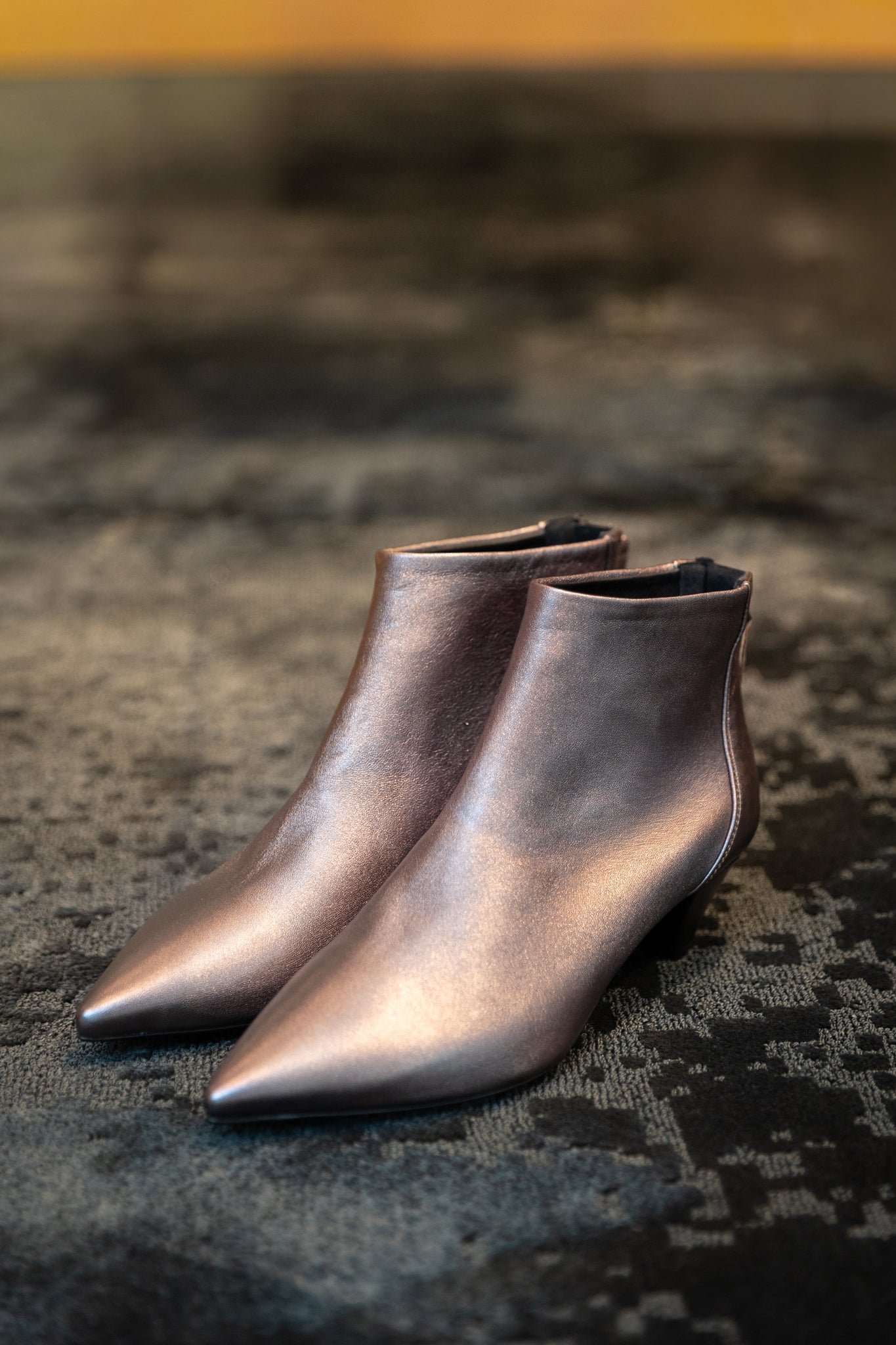 Ankle boot sfilato che ha la stessa linea del nostro best seller Seraphine ma con un tacco a cono ricoperto di 4 cm e mezzo. Realizzato completamente in pelle laminata color bronzo con suola in gomma e fodera in nappa. Il tacco a cono  lo rende più disinvolto e alla moda pur non togliendo nulla alla comodità e alla funzionalità. Come tutte le nostra scarpe è lavorato in Italia artigianalmente.