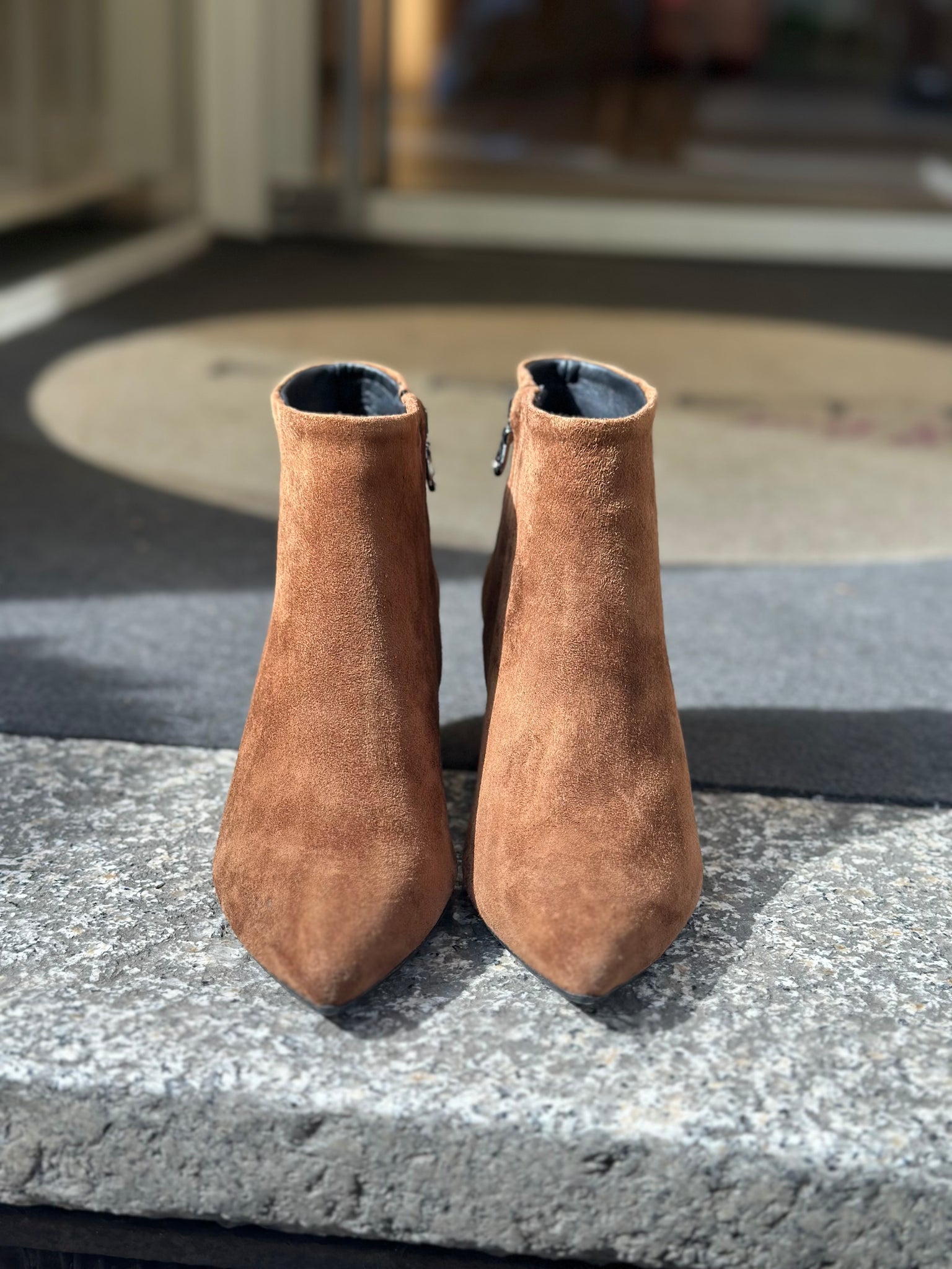 Ankle boot in suede color sigaro con zip interna alla caviglia e suola in gomma. Completamente foderato in pelle.Il tacco ha una forma sciancrata ma con una solida base di appoggio quadrata ed è alto 5,5 cm.È una lavorazione italiana e artigianale