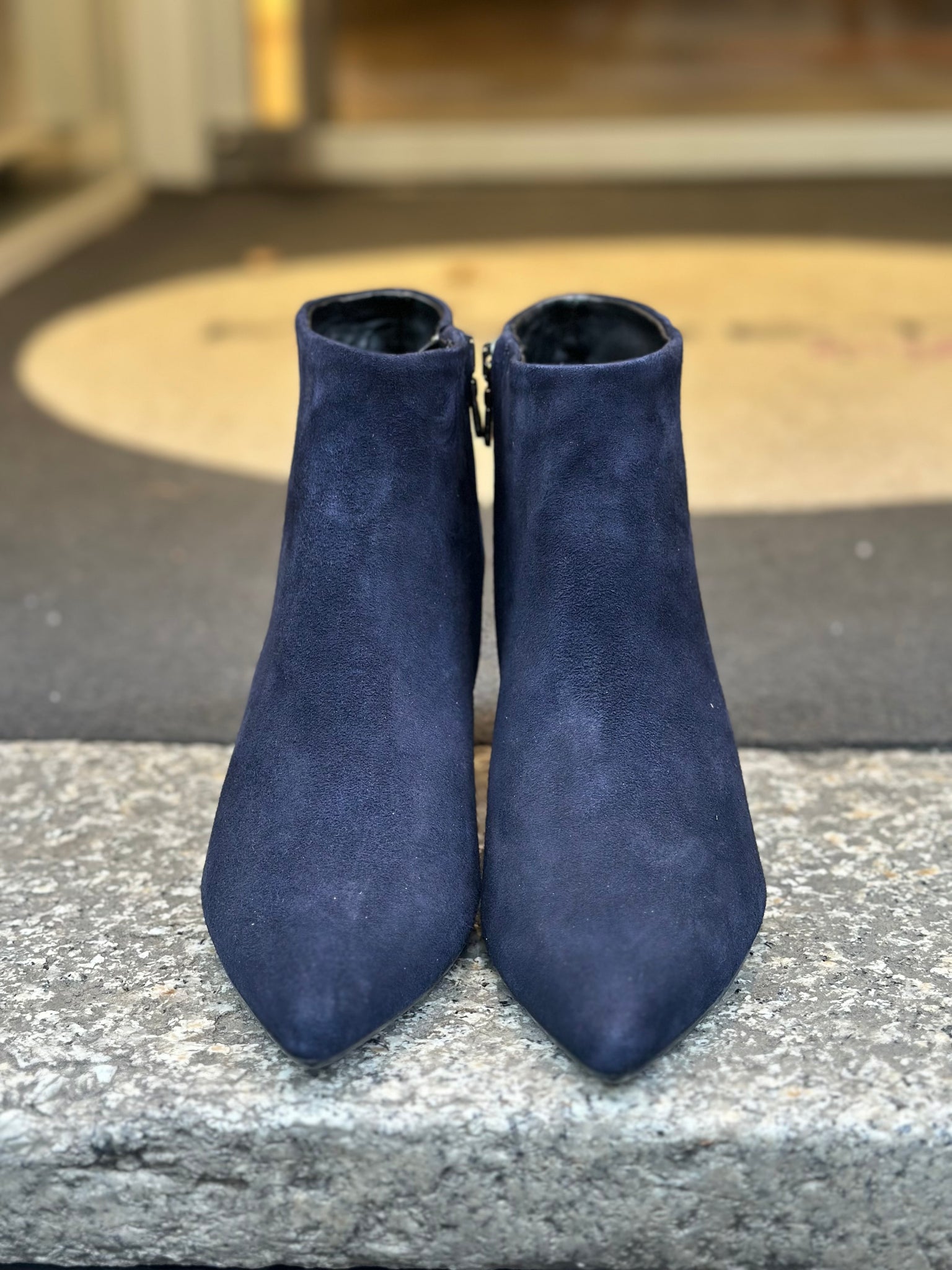 Ankle boot in suede blu con zip interna alla caviglia e suola in gomma. Completamente foderata in pelle.Il tacco ha una forma sciancrata ma con una solida base di appoggio quadrata ed è alto 5,5 cm.È una lavorazione italiana e artigianale
