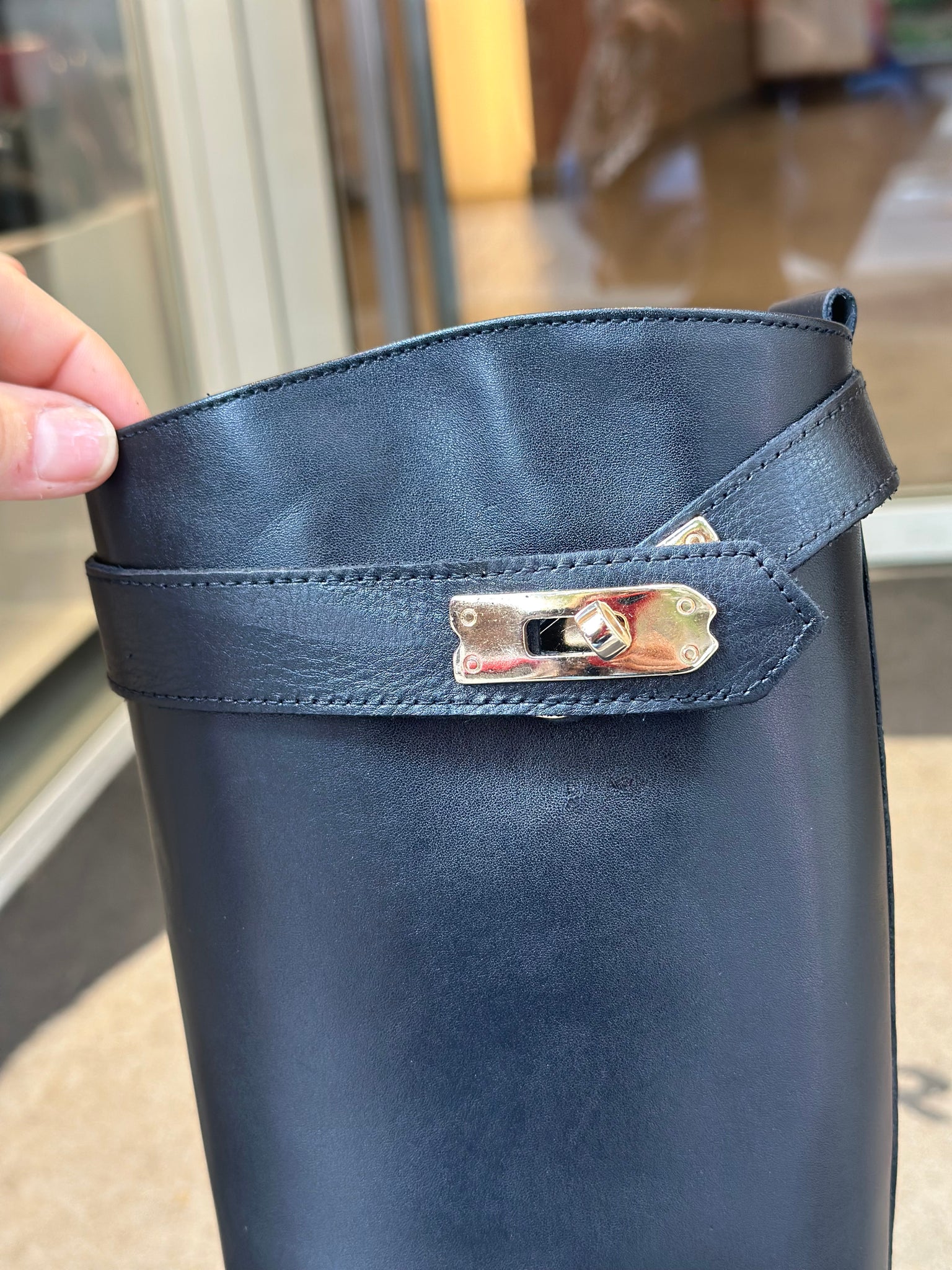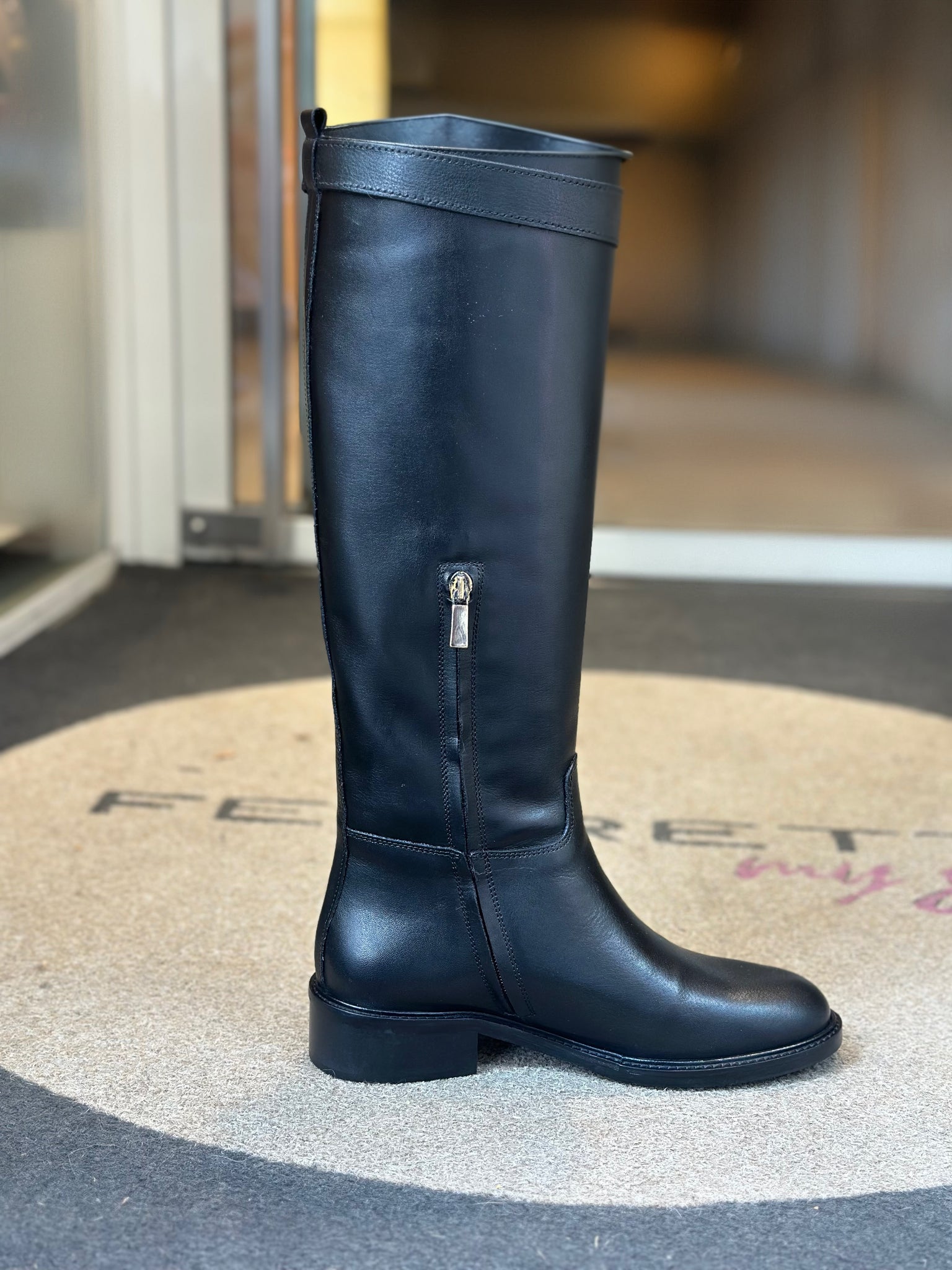 Stivale tipo cavallerizzo in pelle nera  con cinturino e fibbia dorata che si può comodamente sfilare per un effetto più semplice e classico. Ha una suola in gomma ed un comodo tacco di 3 cm e mezzo ed è completamente foderato in pelle. L'interno della gamba ha una mezza zip che permette l'ingresso molto comodamente con un tirante dorato che richiama la fibbietta. Per chi è affezionato ai classici evergreen che nel tempo non deludono mai.