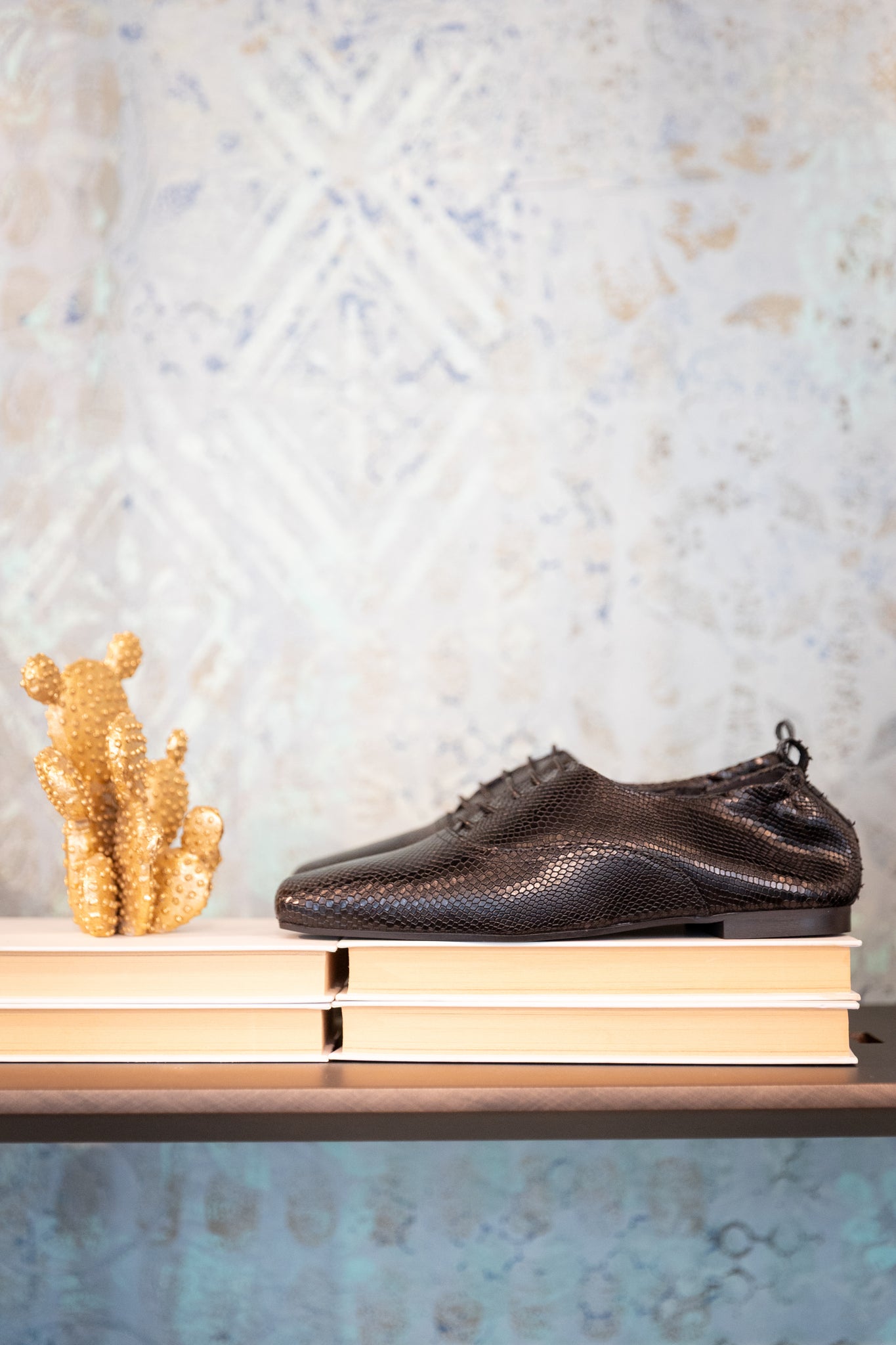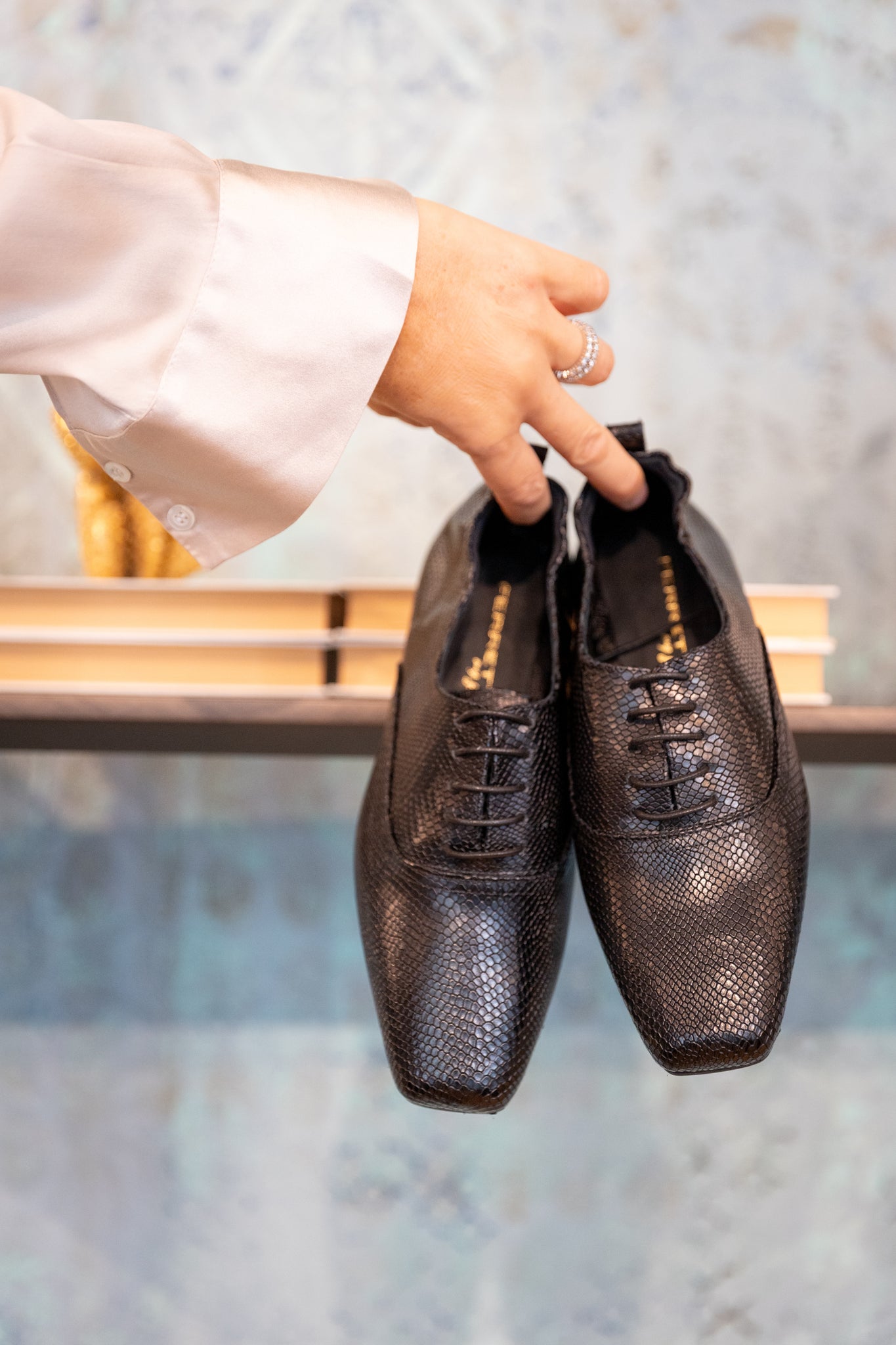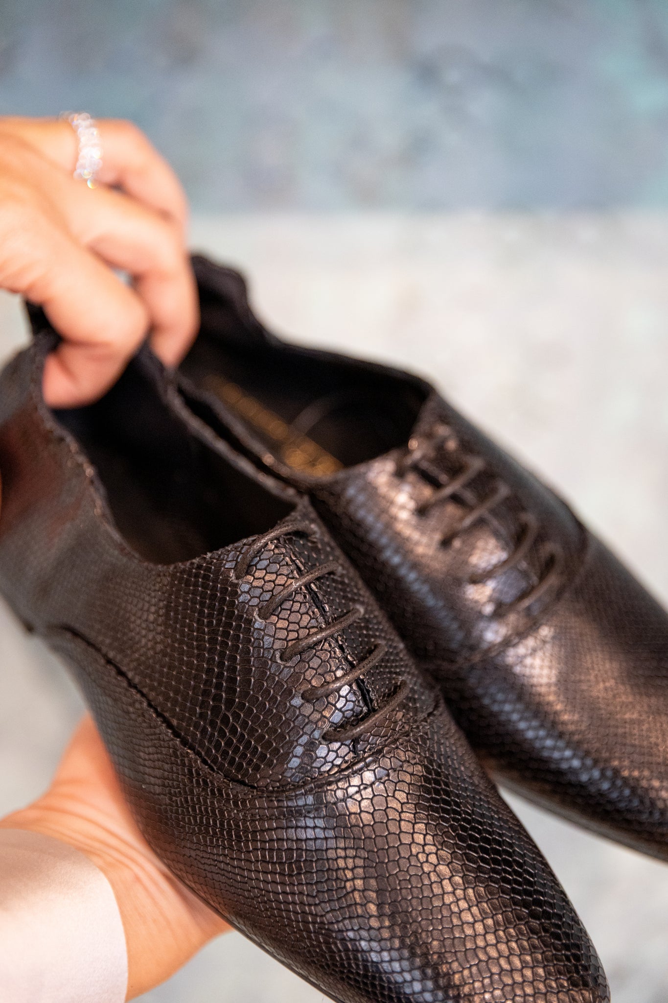 Francesina allacciata in pelle stampata rettile nero con punta squadrata e comodissimo elastico sul tallone per una migliore aderenza al piede. Completamente foderata in pelle con suola in gomma. Il tacco è di circa 1 cm ed è lavorata artigianalmente in Italia.