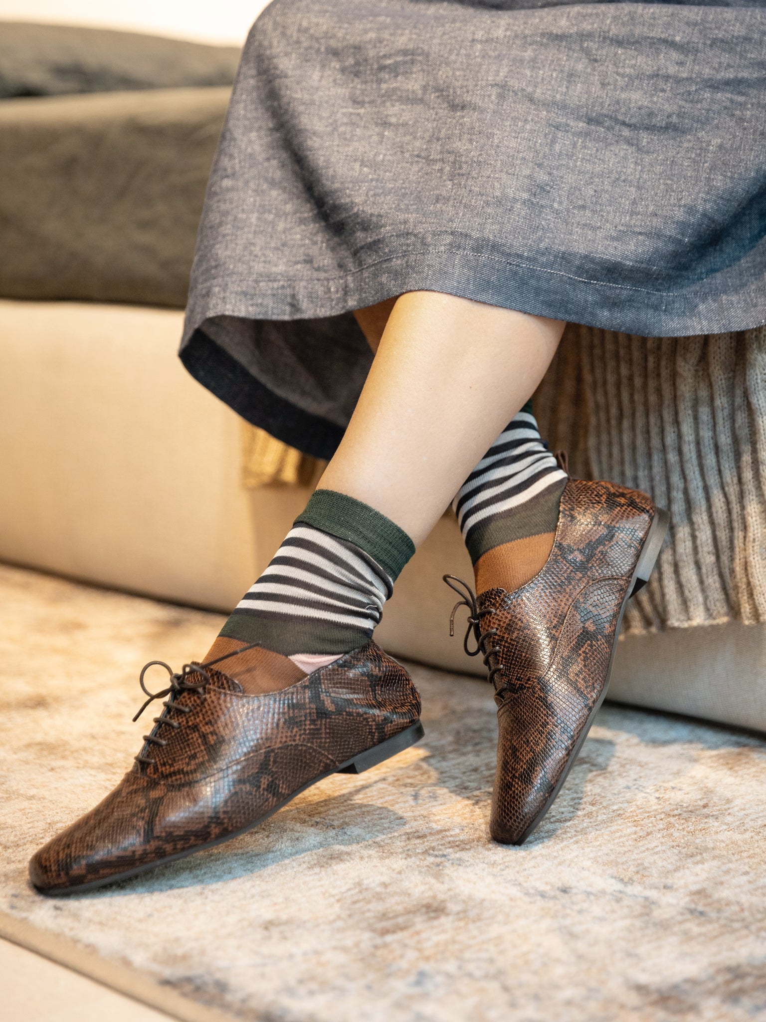 Francesina allacciata in pelle stampata rettile in un bellissimo marrone striato con punta squadrata e comodissimo elastico sul tallone per una migliore aderenza al piede. Completamente foderata in pelle con suola in gomma. Il tacco è di circa 1 cm ed è una lavorazione  artigianale Italiana