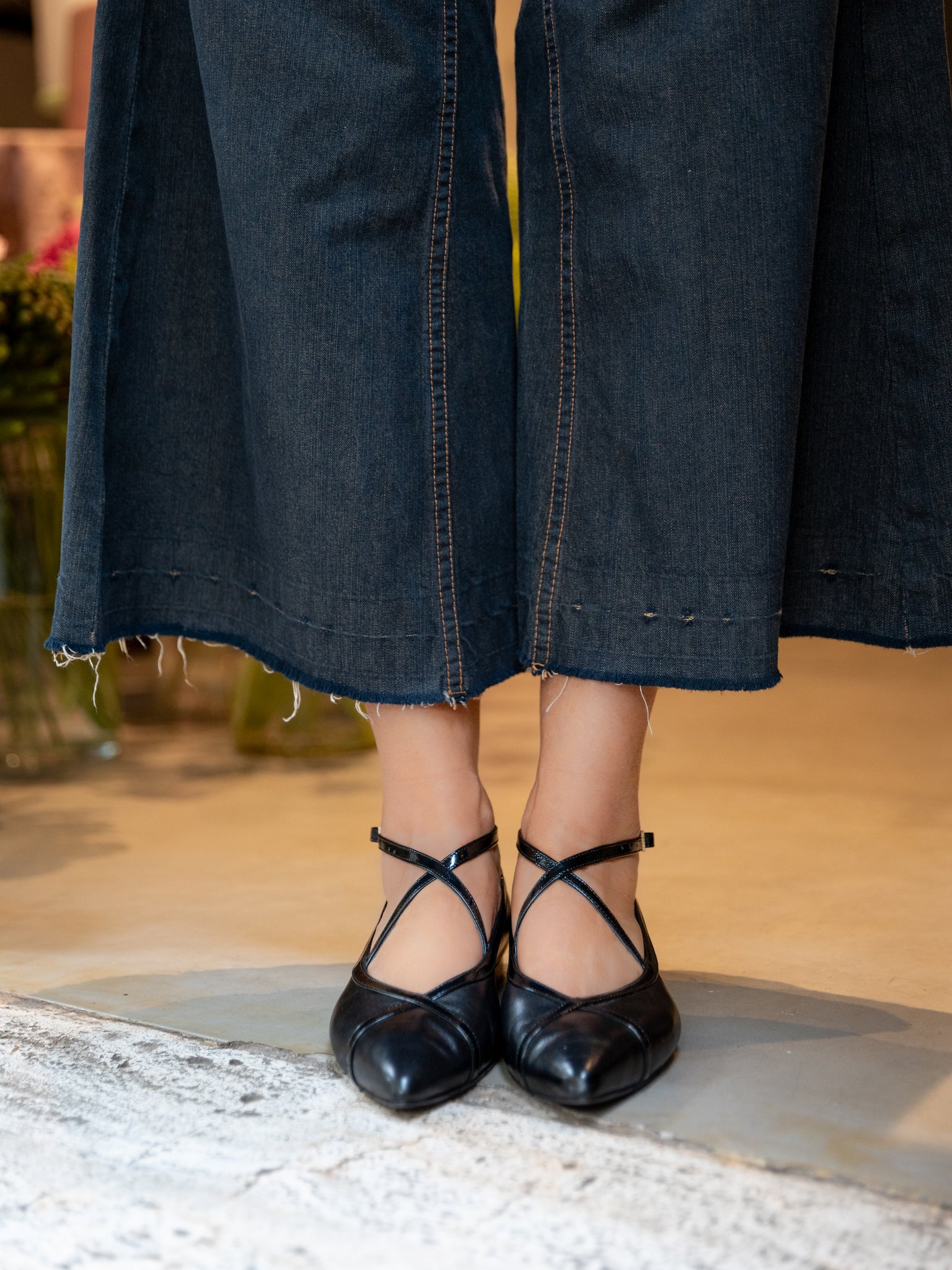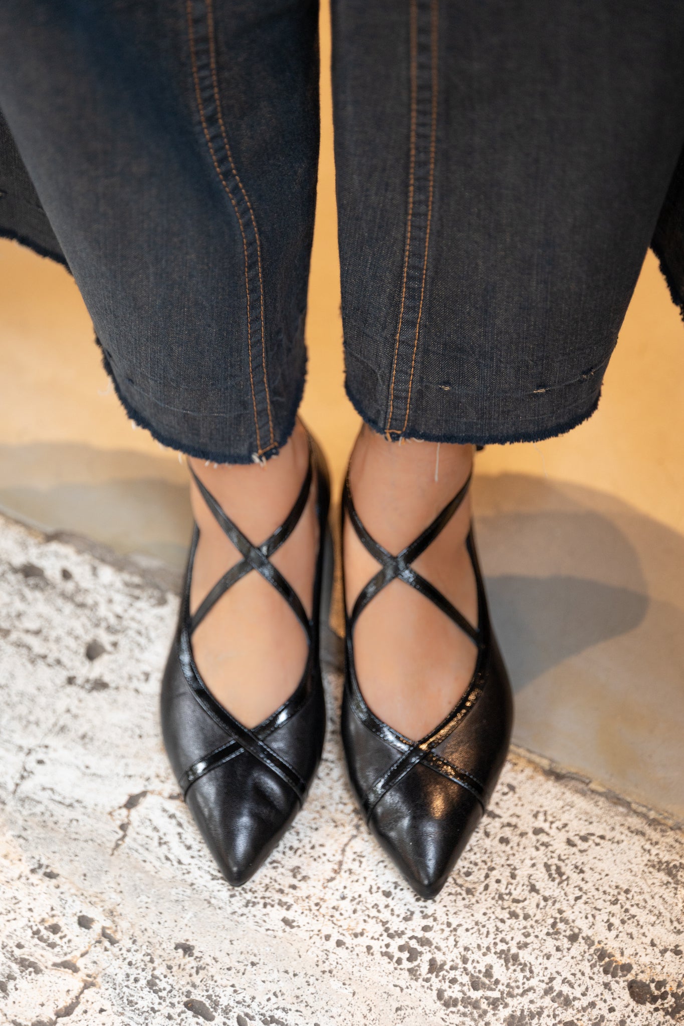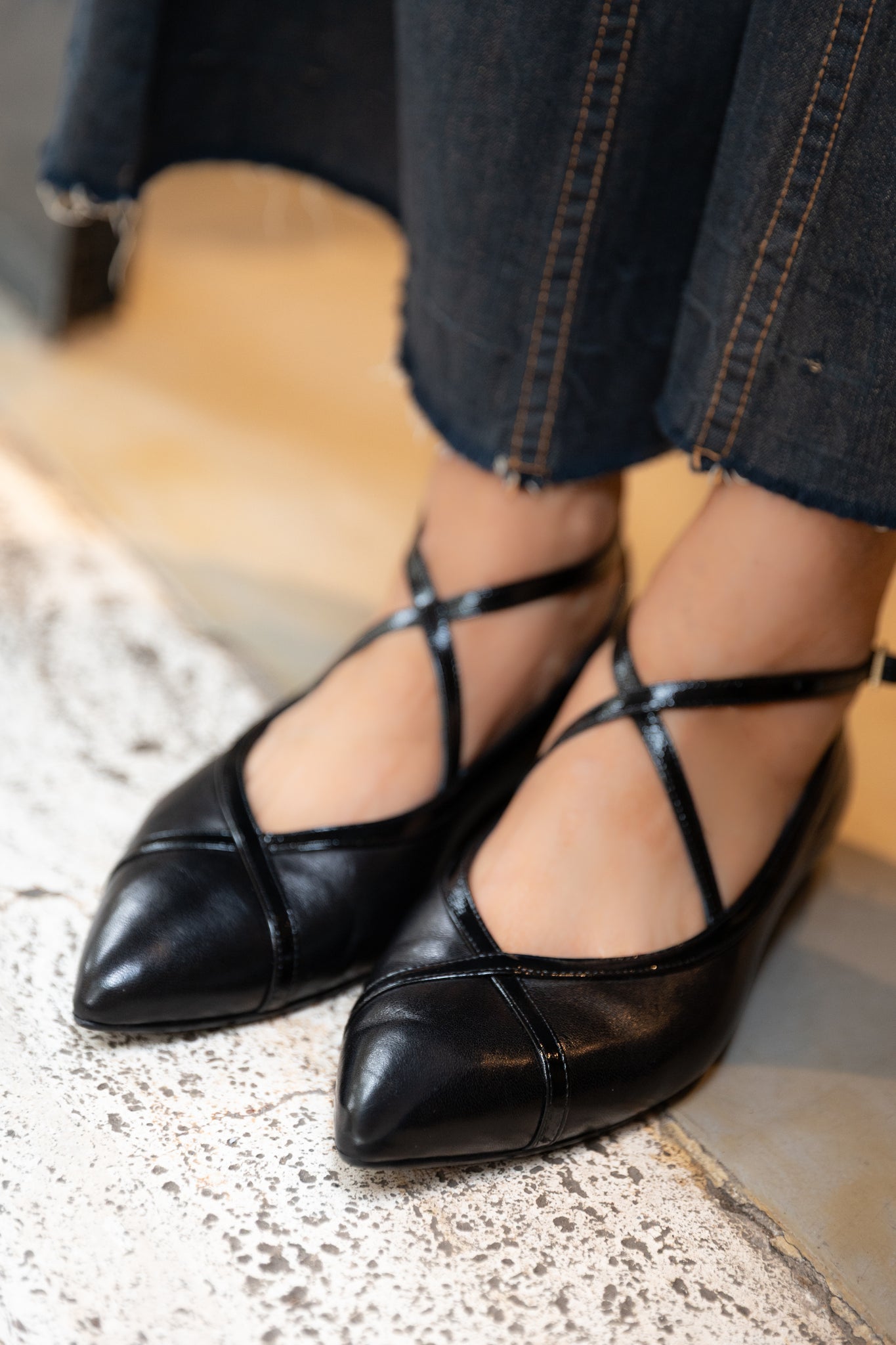Ballerina in nappa nera con cinturini in vernice in tinta che incrociano sul collo del piede. La fibbietta è un piccolo gioiellino quadrato di strass e la soletta interna è imbottita e morbidissima. La scarpa è lavorata a sacchetto. Questo tipo di lavorazione dona al prodotto uno straordinario comfort e una massima flessibiltà. La suola è in gomma e il tacco è alto quasi 2 cm. Lavorata completamente in Italia da abili artigiani qualificati.