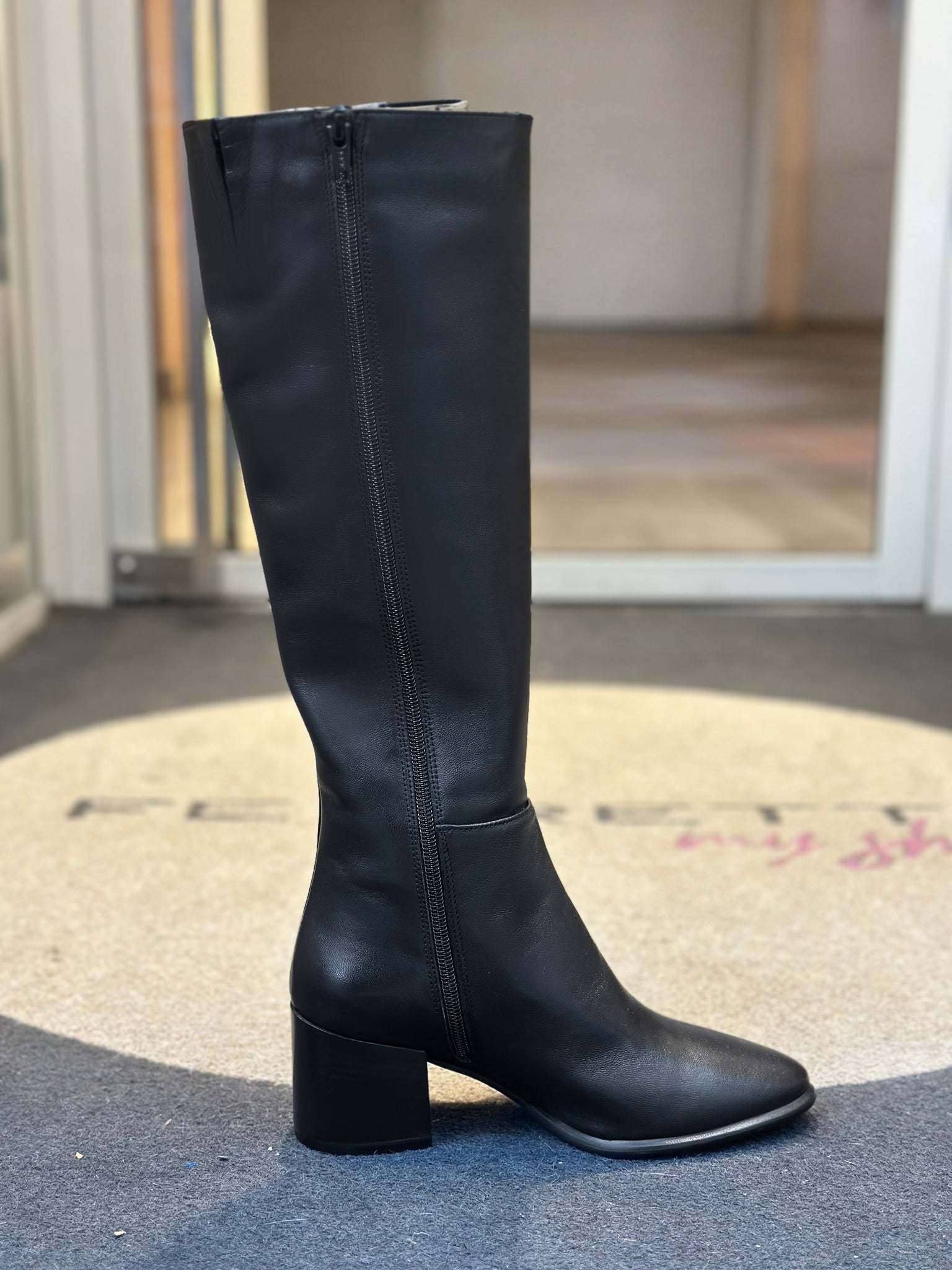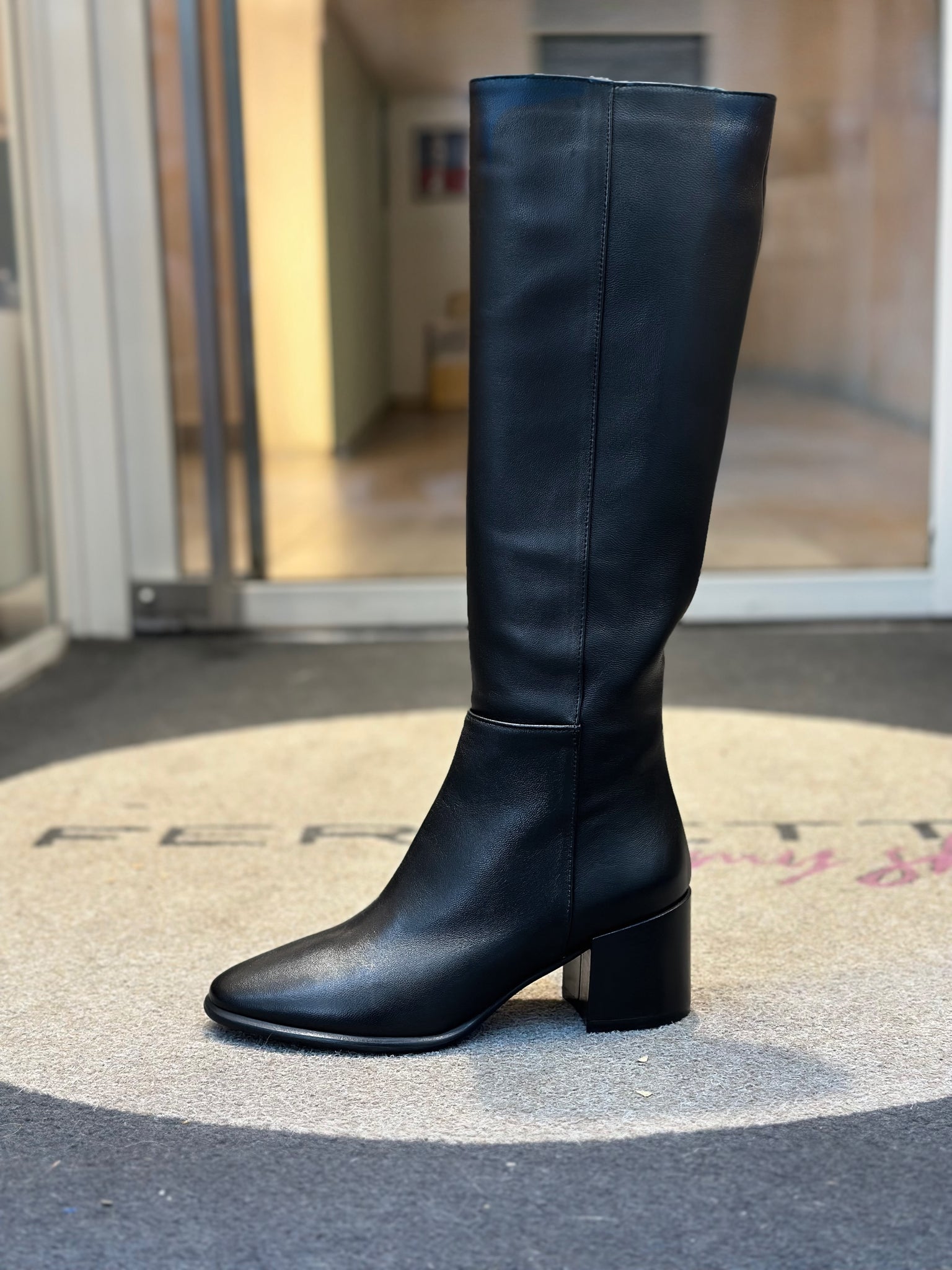 Stivale in morbida pelle nera di forma leggermente affusolata con tacco grosso e zip interna. Totalmente foderato in pelle con suola in gomma.L'altezza del tacco è di 6 cm.L'altezza del gambale è di 40 cm partendo dalla suola lateralmente. Ha una circonferenza di 34 cm. Le misure si riferiscono al numero 36.Ha un piccolo inserto elastico all’interno del gambale per permetterne la calzata a qualunque tipo di polpaccio.Made in Italy. Lavorazione artigianale.