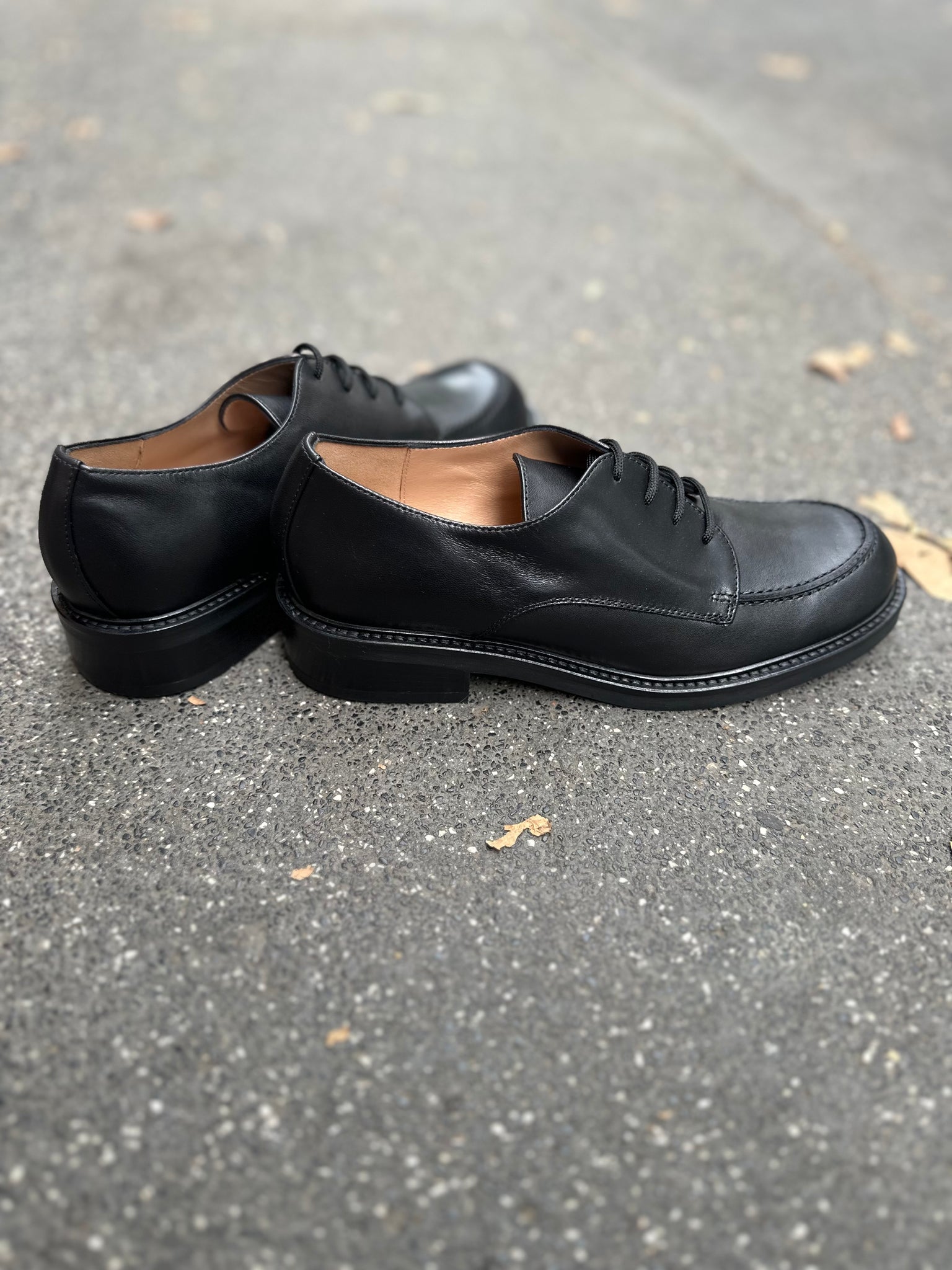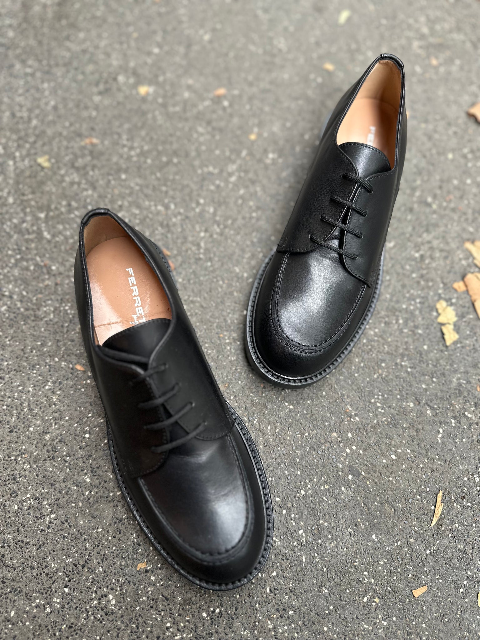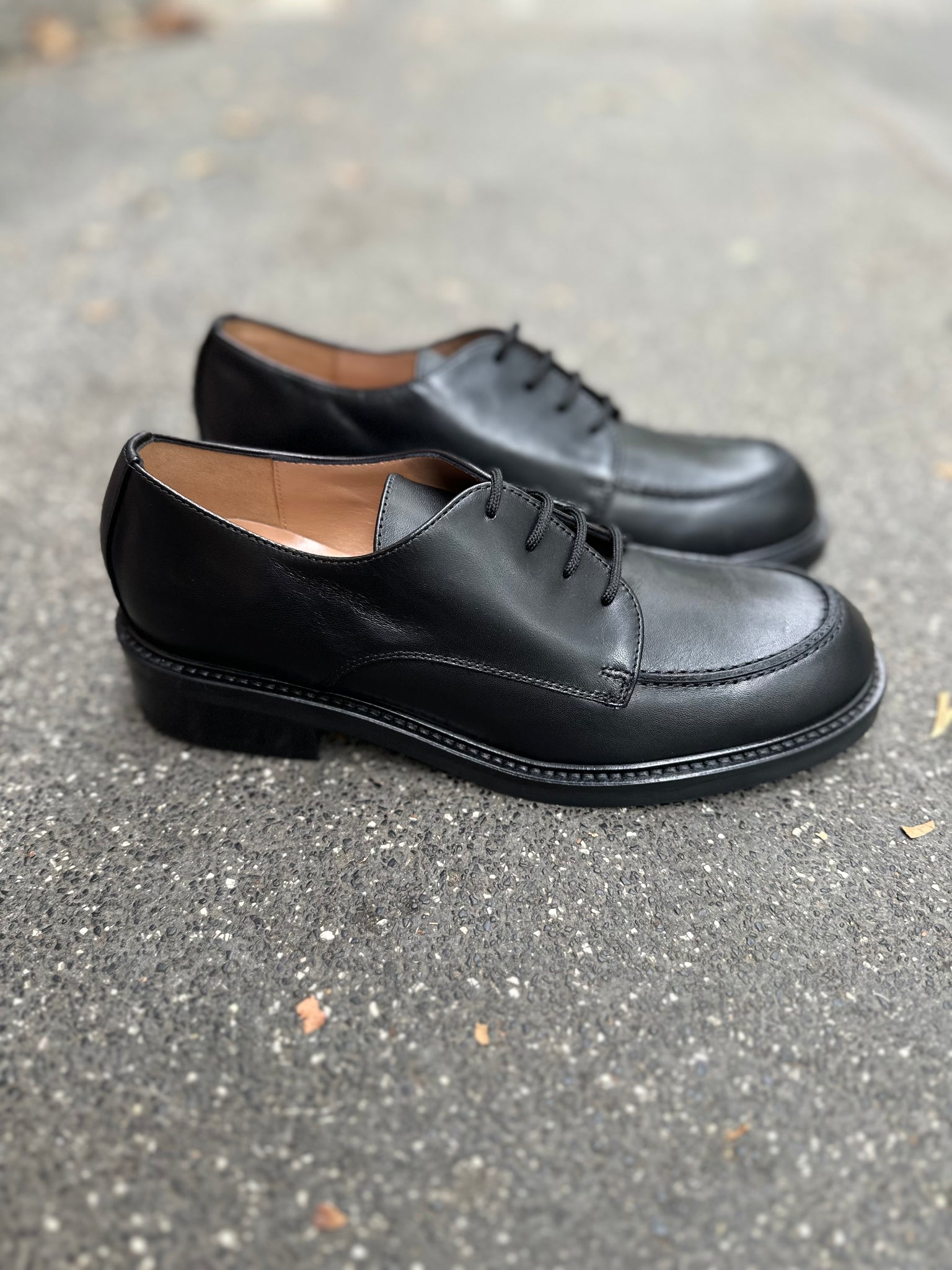 Stringata in stile maschile con cucitura tipo mocassino e allacciatura derby in uno splendido pellame nero. E' lavorata in Italia artigianalmente ed è completamente foderata in pelle con una suola in gomma di 1 cm. Il tacco è anch'esso in gomma ed è alto circa 3 cm.