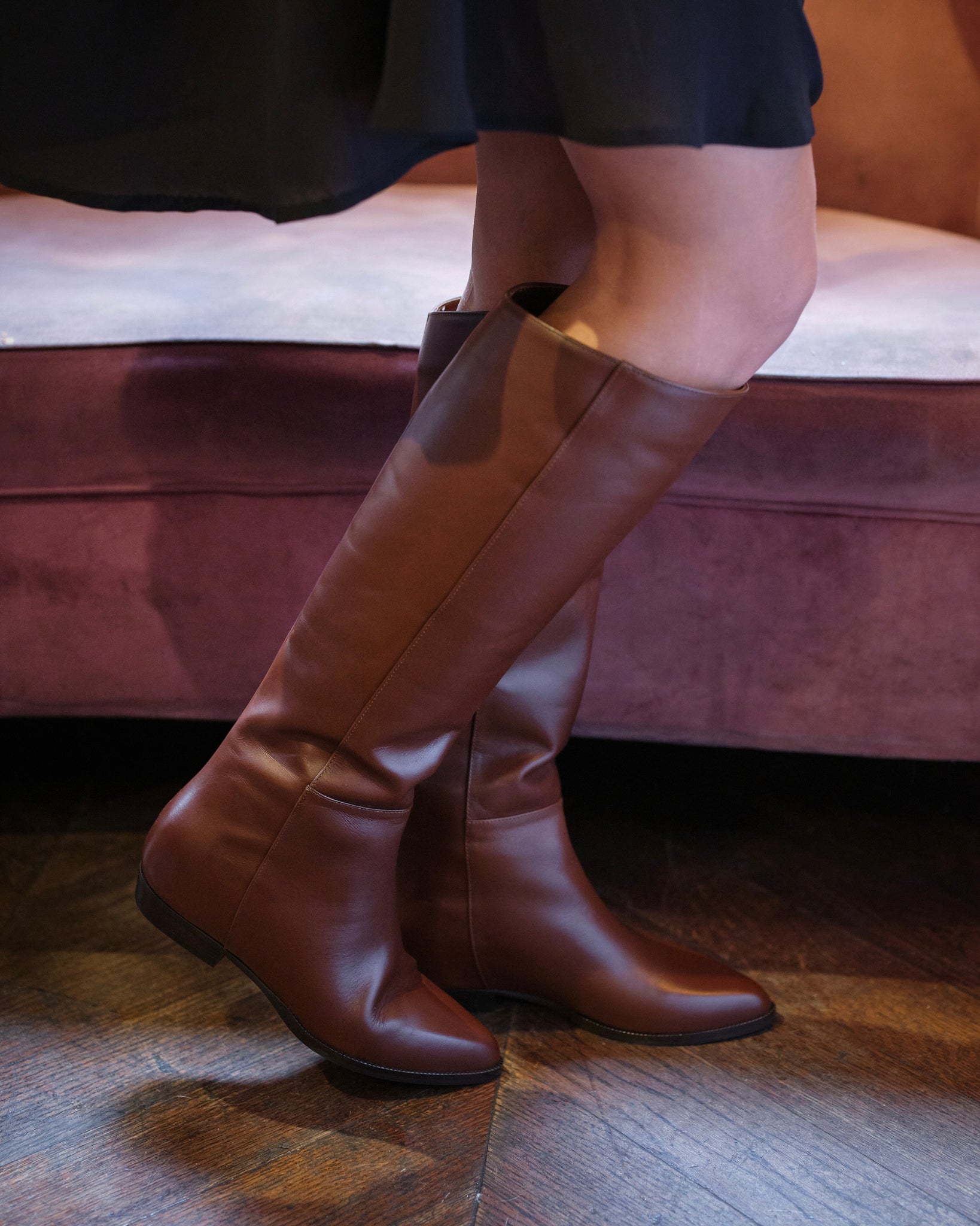 Stivale a forma sfilata in pelle color mogano oppure nero con gamba a tubo. Si calza senza zip e ha la caratteristica di avere un comodo rialzo interno di circa 3 cm che sommato ad il tacco esterno di 2 ha un'altezza complessiva di 5 cm . La suola è in gomma ed è completamente foderato in pelle. Lavorato da abili artigiani italiani.