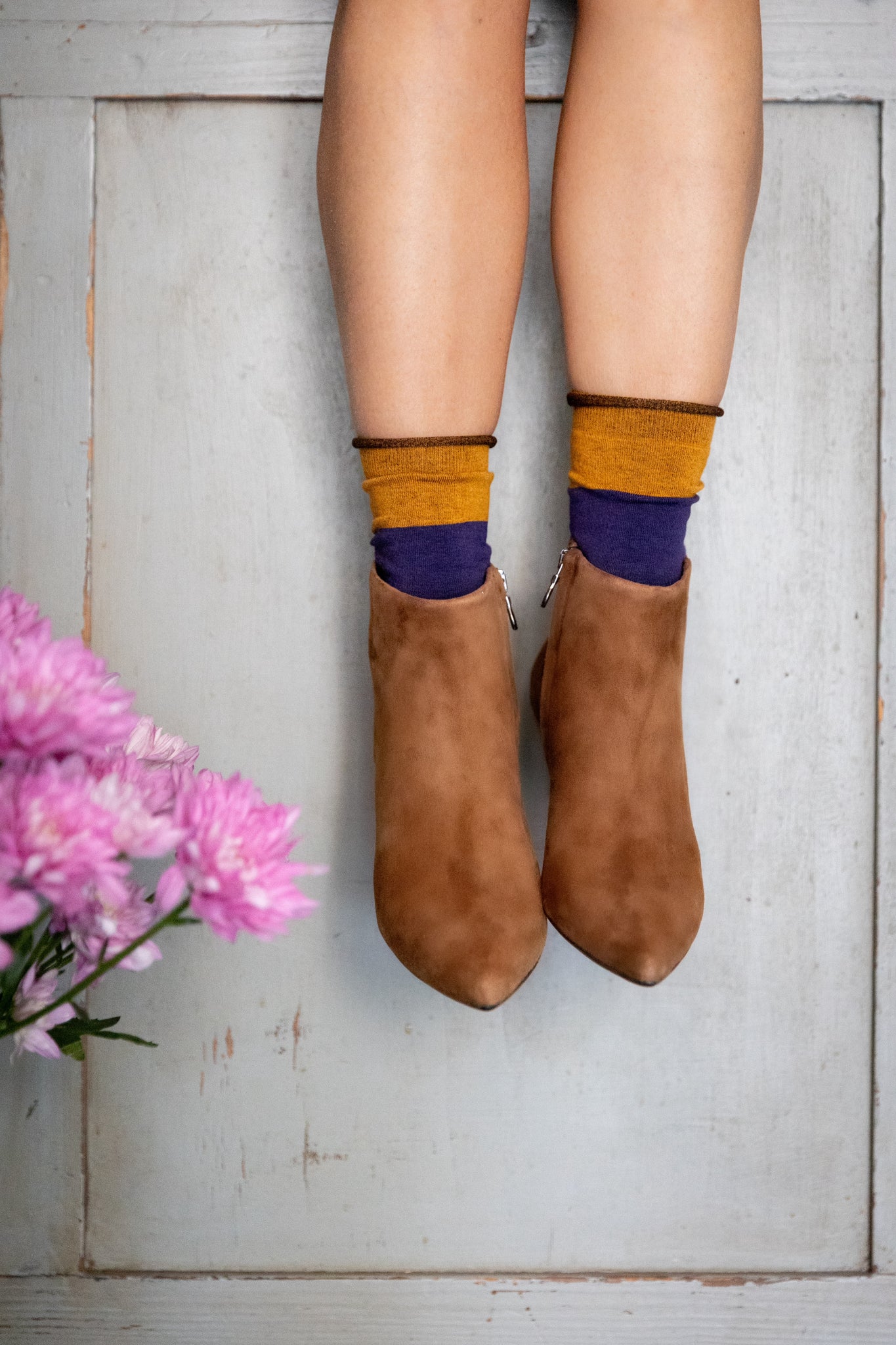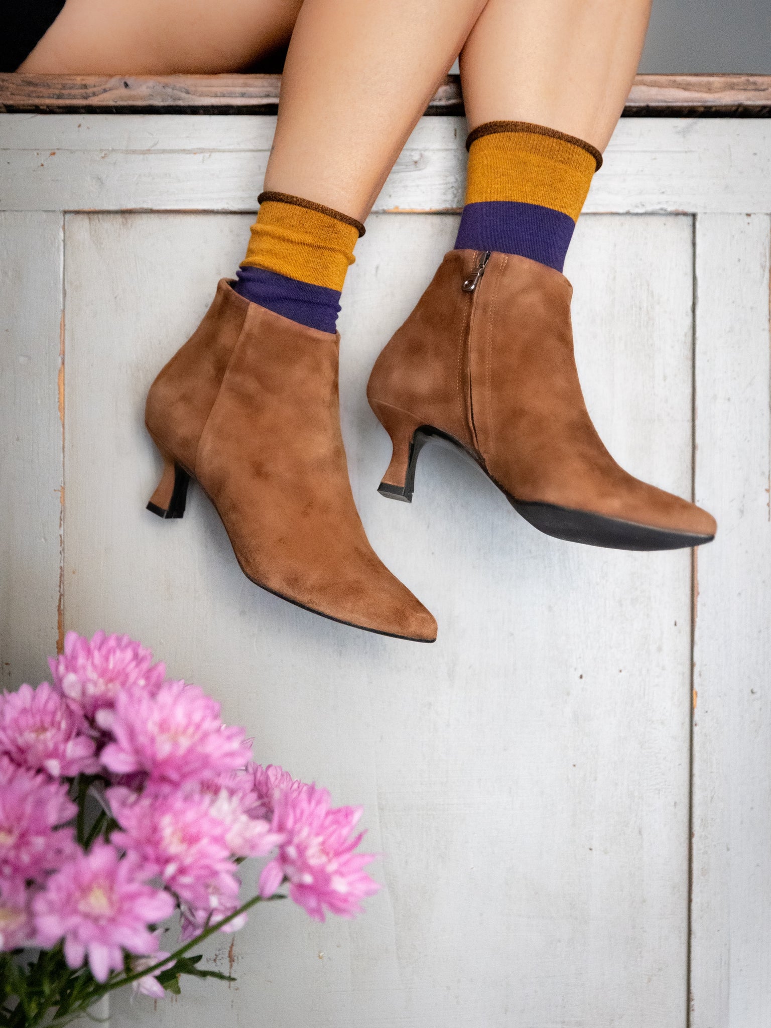 Ankle boot in suede color sigaro con zip interna alla caviglia e suola in gomma. Completamente foderato in pelle.Il tacco ha una forma sciancrata ma con una solida base di appoggio quadrata ed è alto 5,5 cm.È una lavorazione italiana e artigianale