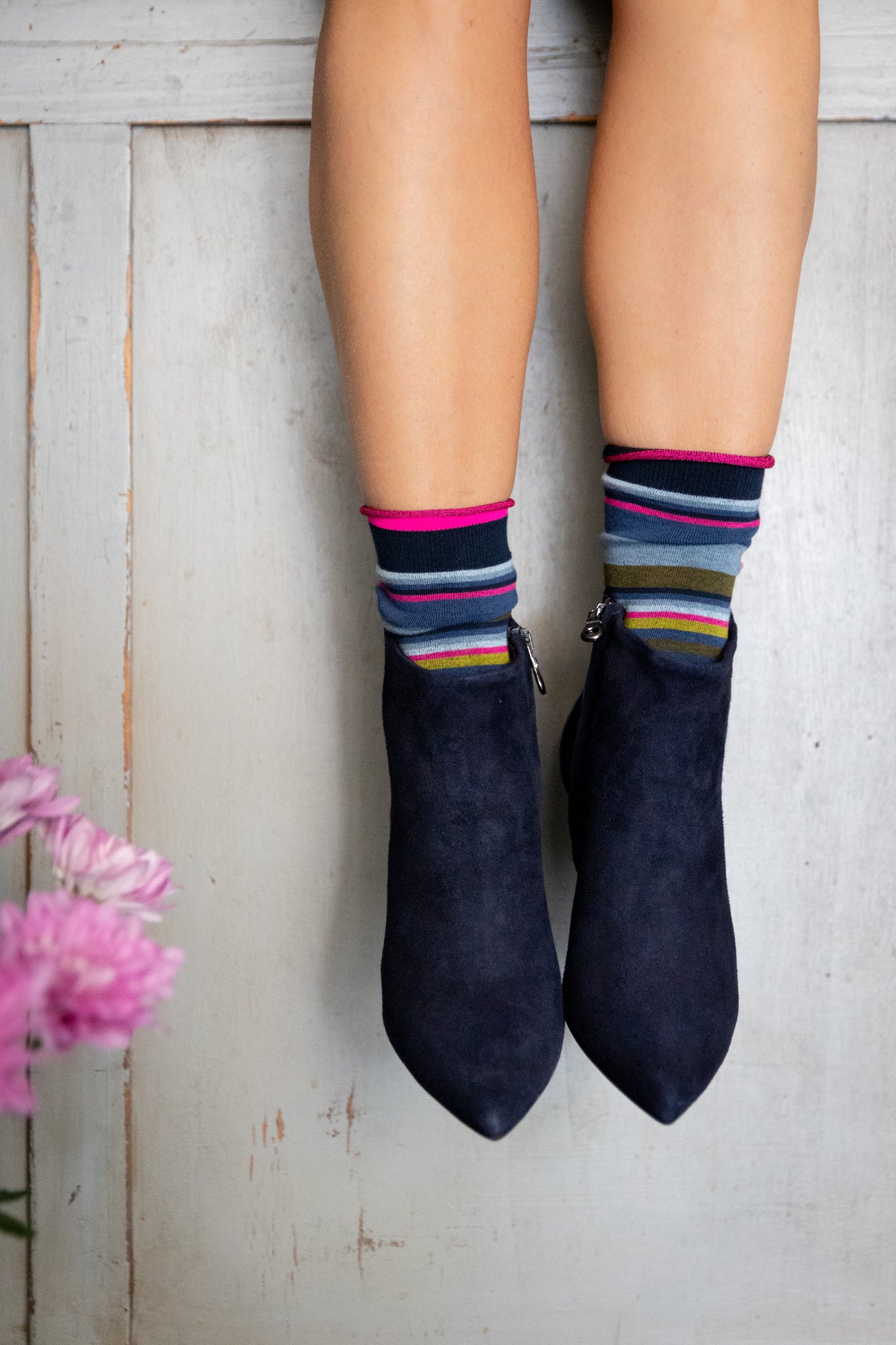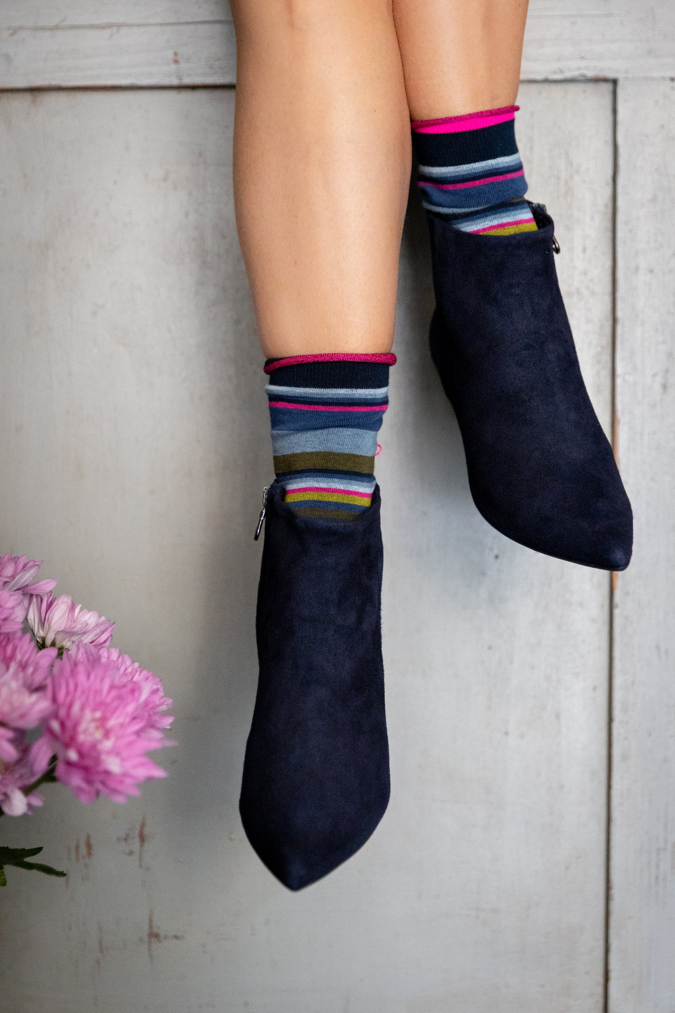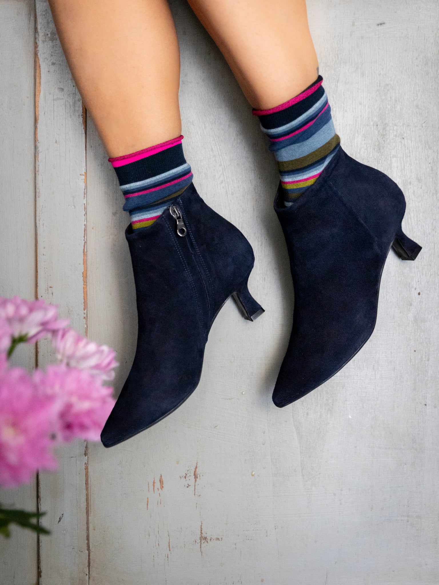 Ankle boot in suede blu con zip interna alla caviglia e suola in gomma. Completamente foderata in pelle.Il tacco ha una forma sciancrata ma con una solida base di appoggio quadrata ed è alto 5,5 cm.È una lavorazione italiana e artigianale