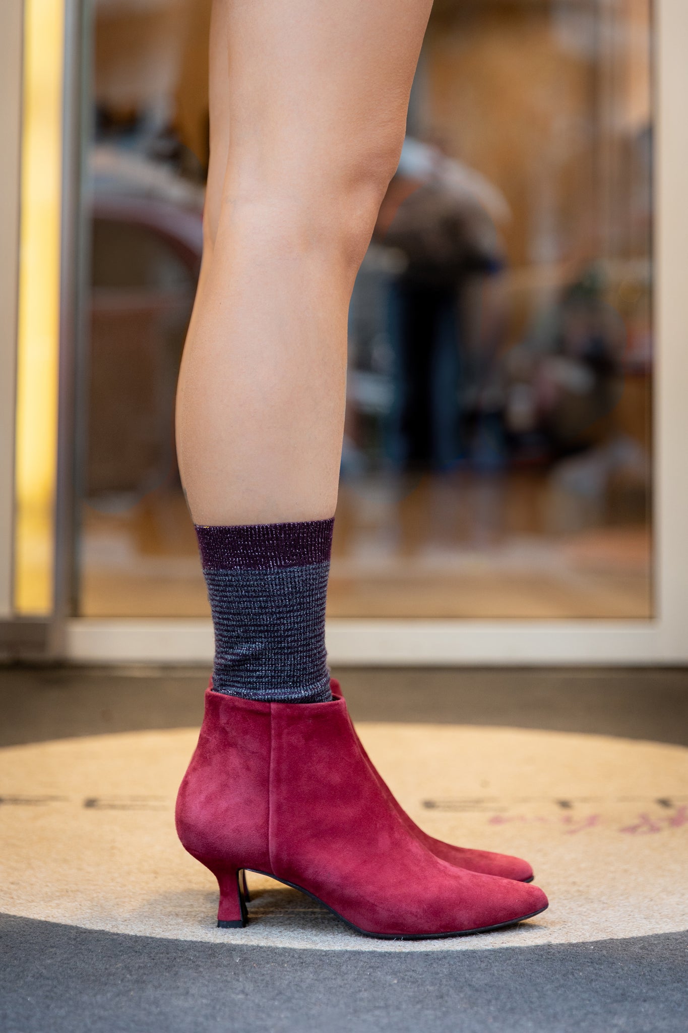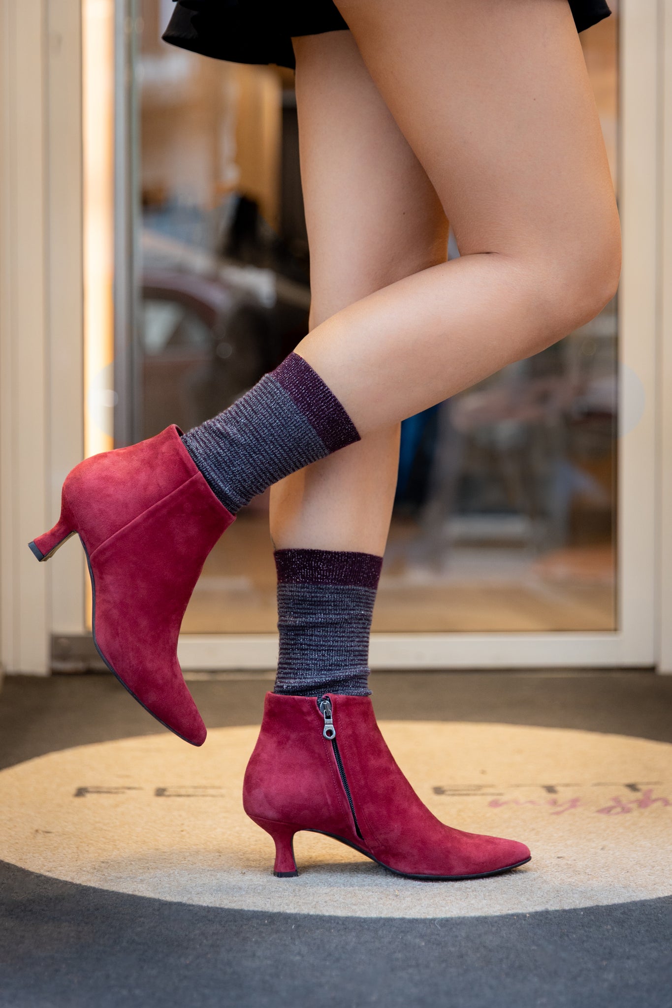 Ankle boot in suede bordeaux con zip interna alla caviglia e suola in gomma. Completamente foderata in pelle.Il tacco ha una forma sciancrata ma con una solida base di appoggio quadrata ed è alto 5,5 cm.È una lavorazione italiana e artigianale