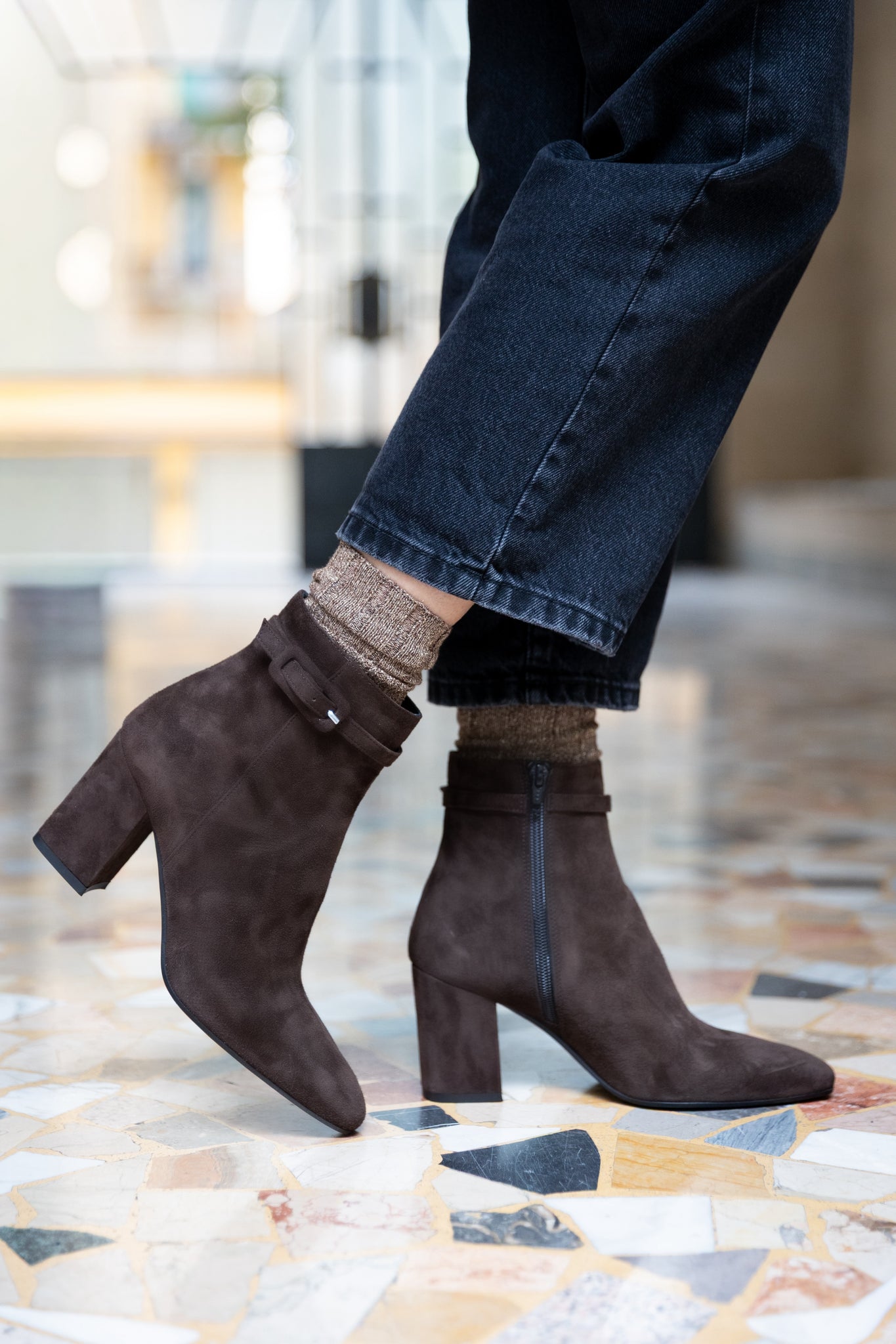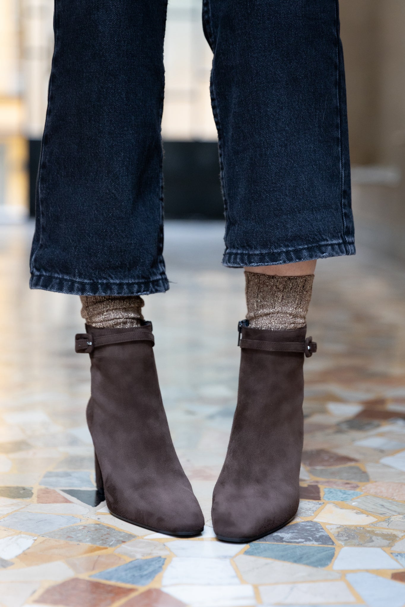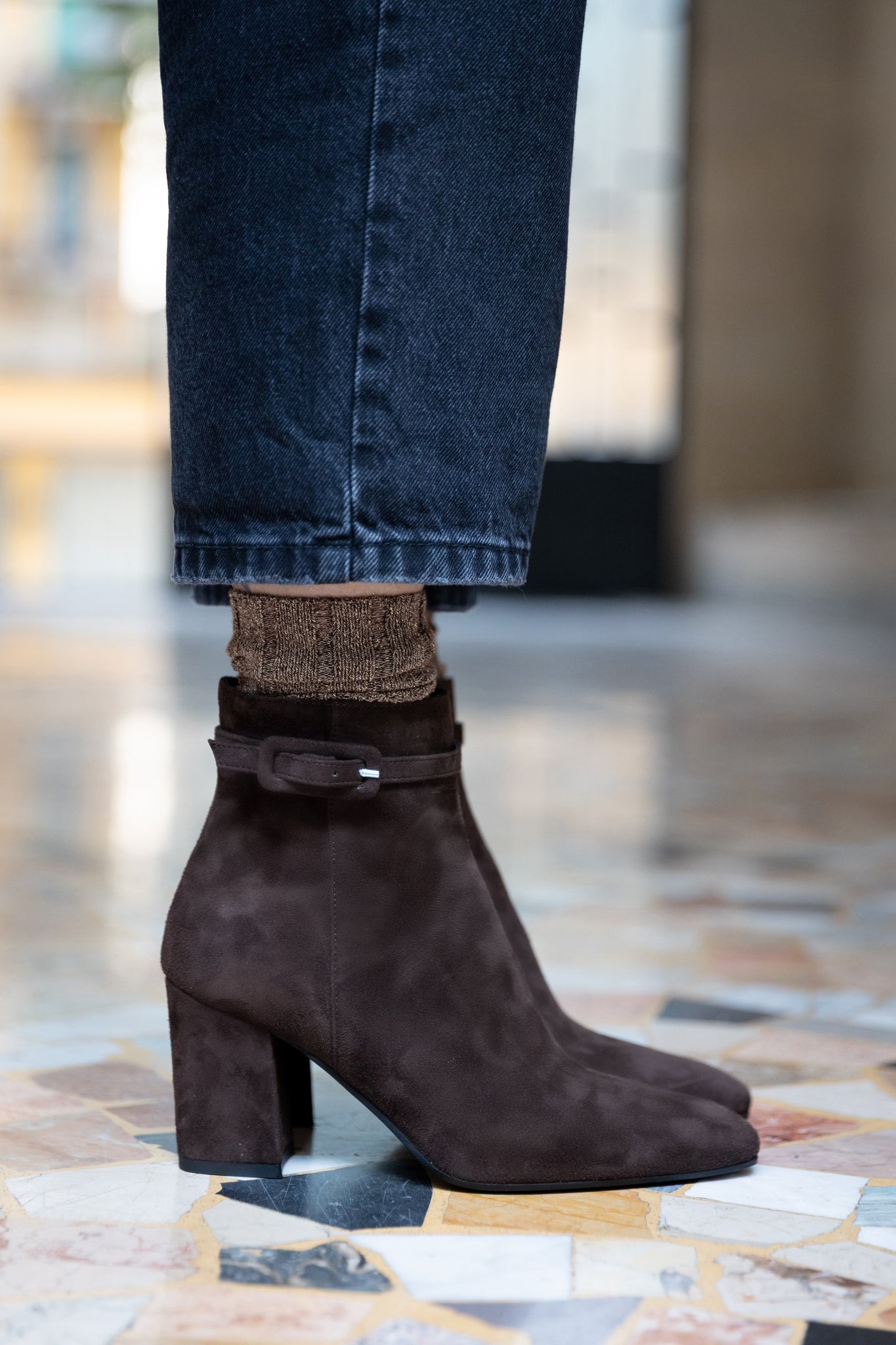 Stivaletto in suede testa di moro di forma squadrata con un comodo tacco largo di 6,5 cm e un cinturino in suede con fibbietta ricoperta sulla caviglia. Ha la suola in gomma ed è completamente foderato in pelle. Calzata con zip interna alla caviglia. Lavorato artigianalmente in Italia.