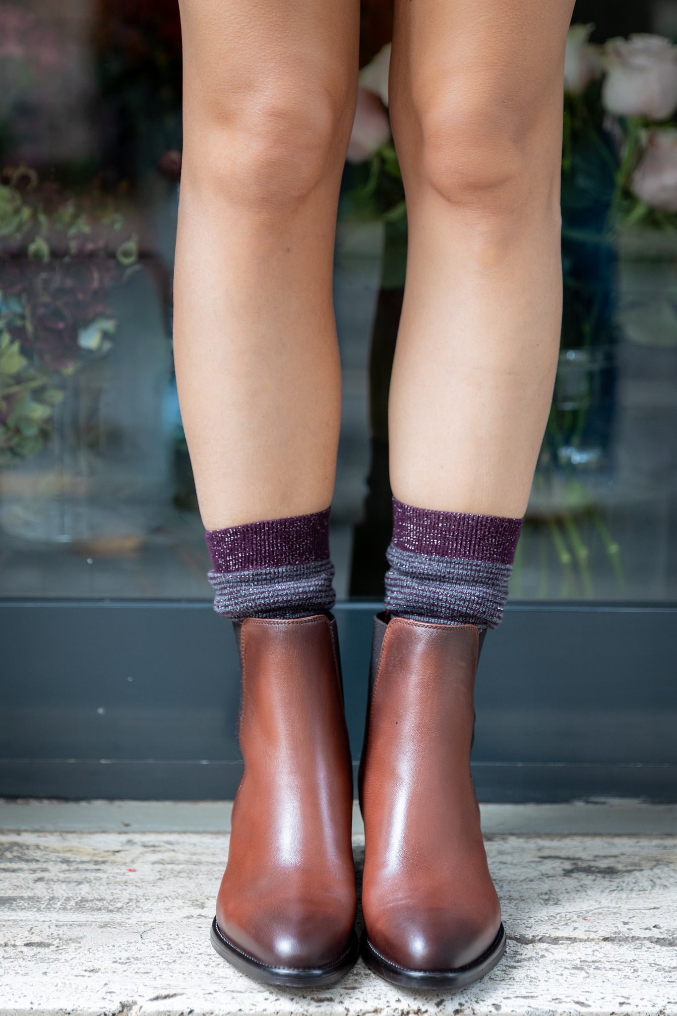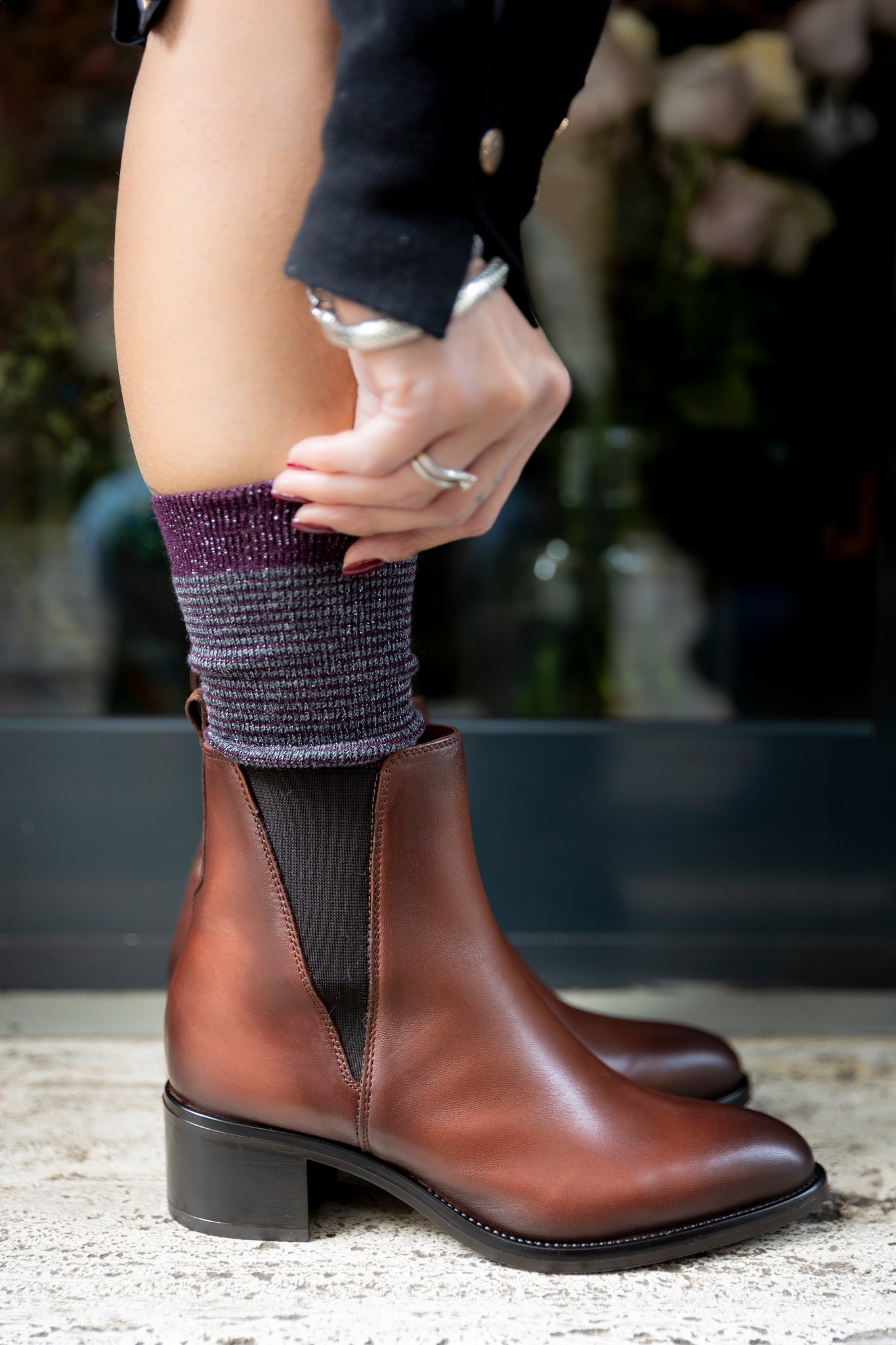 Ankle boot in pelle color brandy leggermente anticata con doppio elastico laterale a V e punta sfilata in lieve stile tex ma con garbo. Ha un comodo tacco grosso di 4 cm, la suola in gomma ed è completamente foderata con una morbida e calda microfibra. Lavorata artigianalmente.
