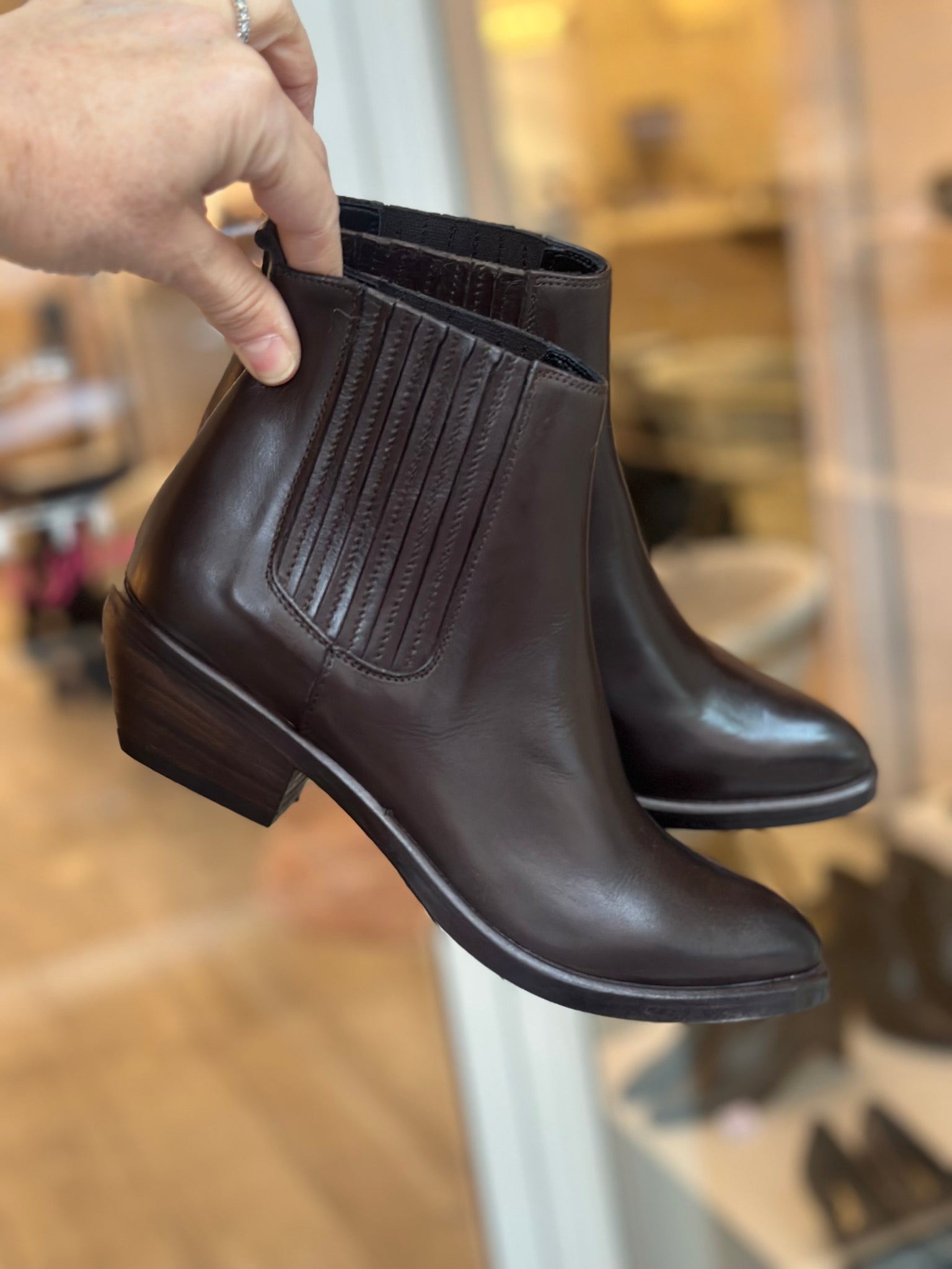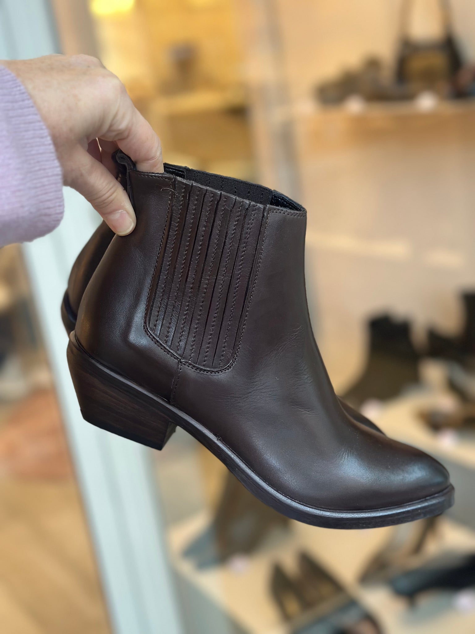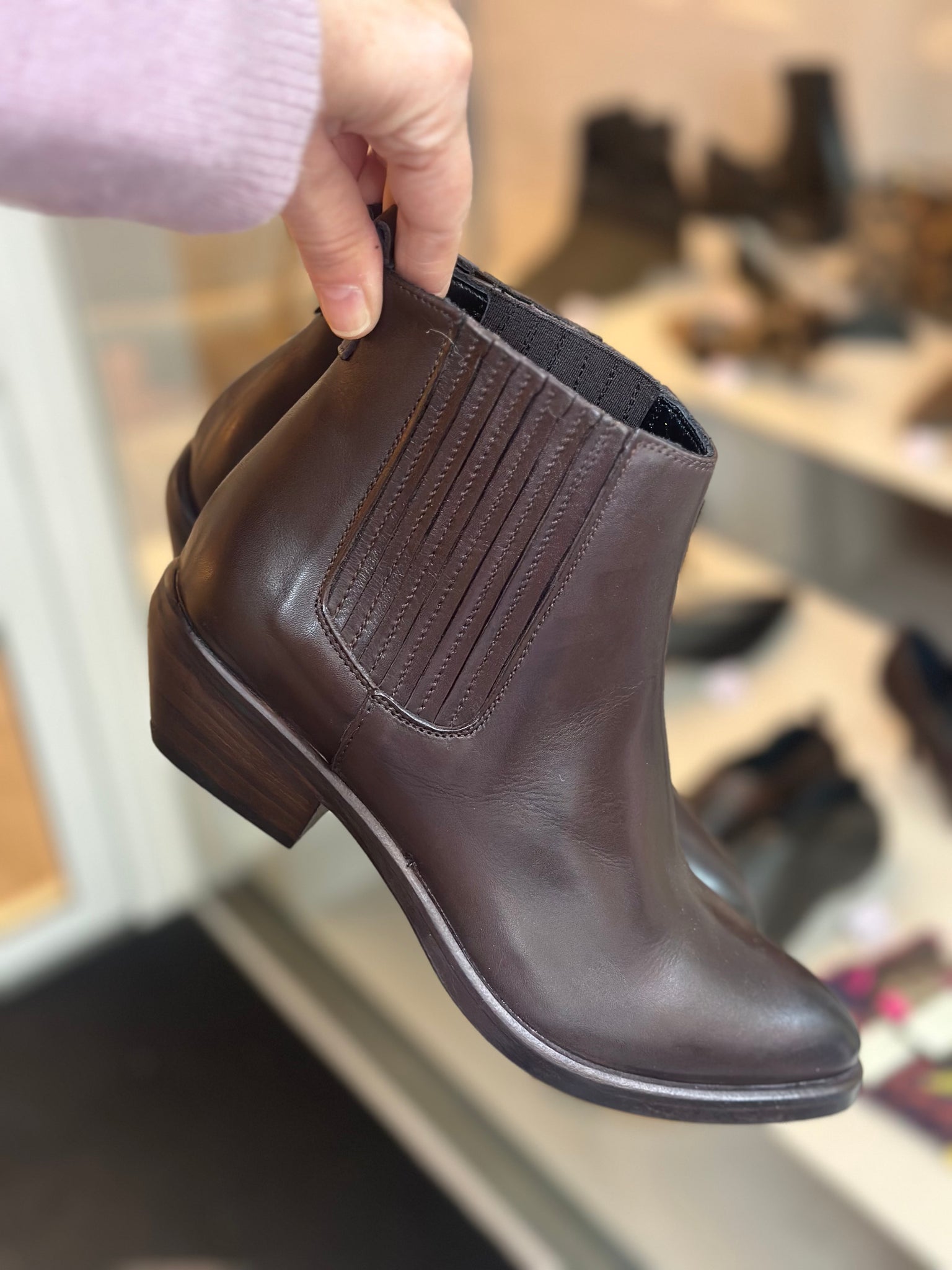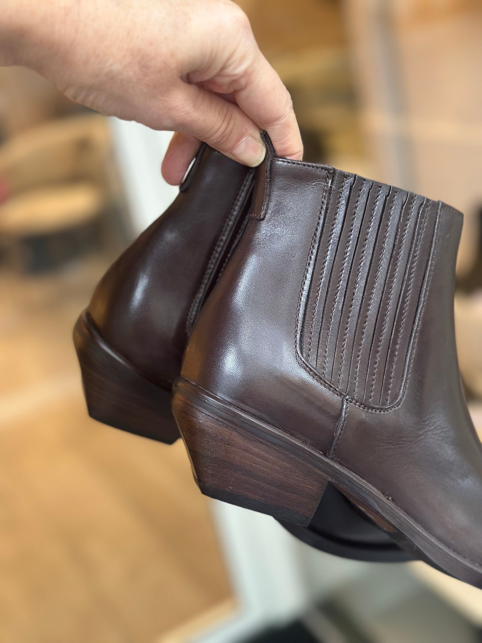 Stivaletto texano in pelle testa di moro con doppio elastico ricoperto in pelle e il classico tacco a rientrare di 4 cm.Ha una suola in vero cuoio con mezza suola in gomma antiscivolo. Completamente foderato in pelle e lavorato artigianalmente in Italia. Grinta da vendere!!