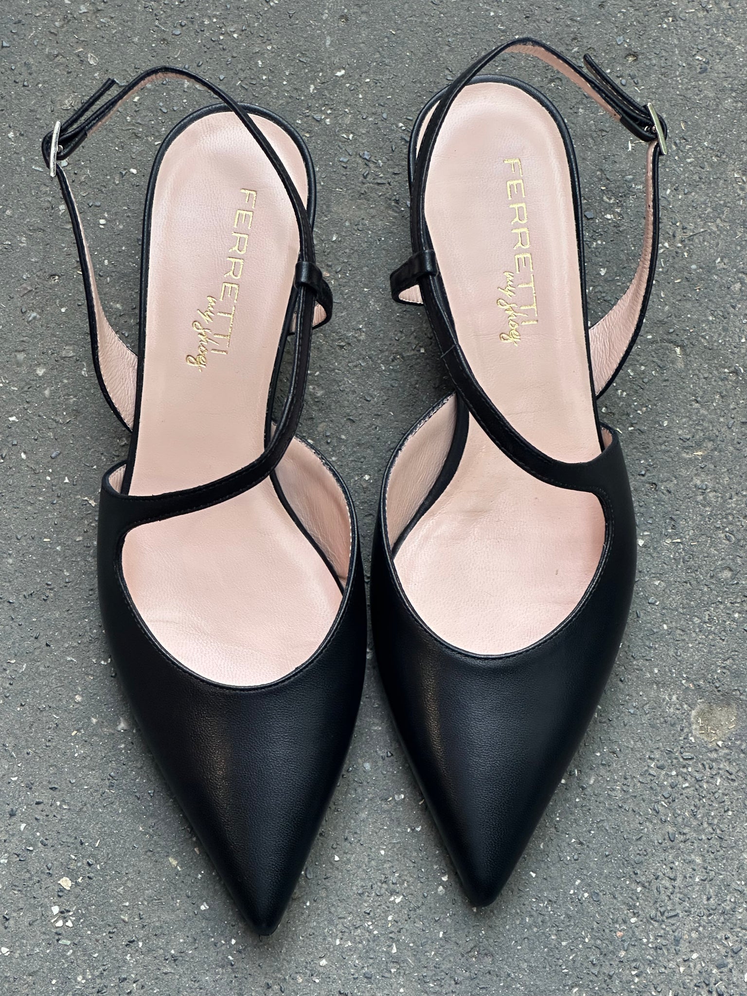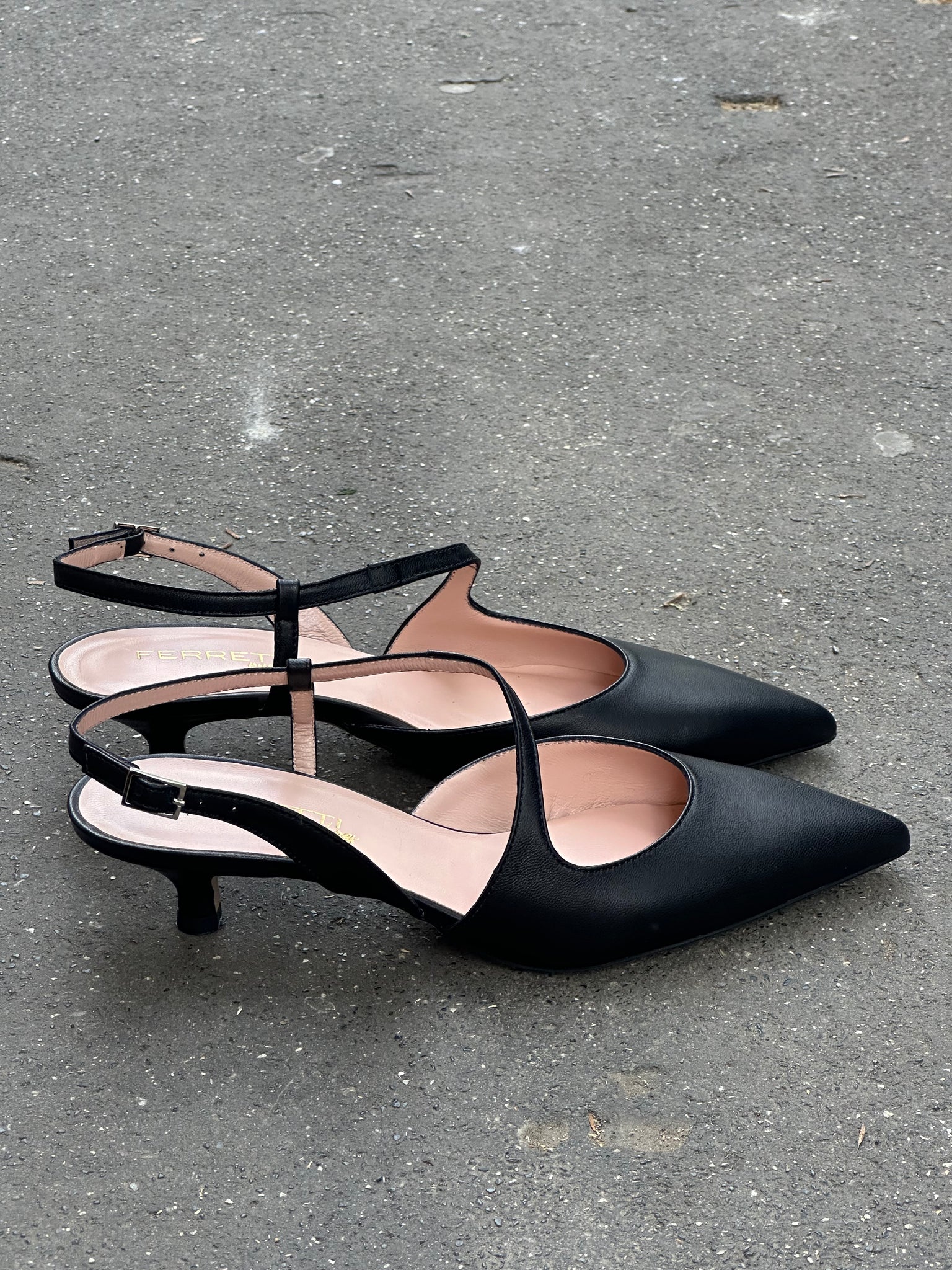 Black leather slingbacks with a pattern on the instep and an adjustable strap.