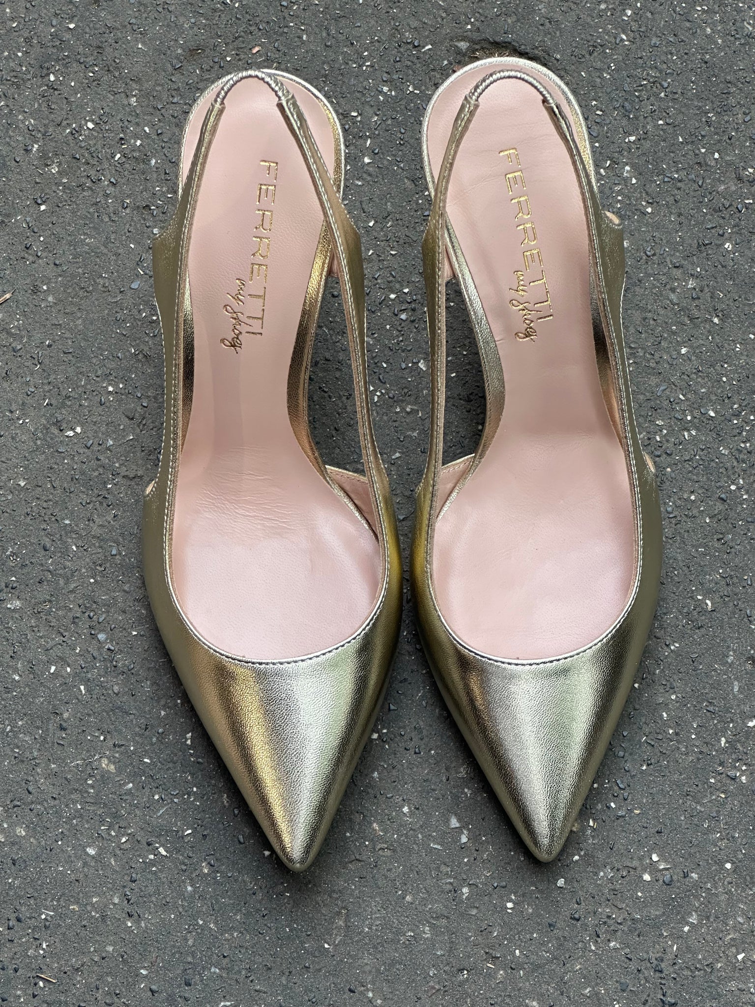 Platinum-colored laminated leather slingback with a tapered silhouette and a 2.8-inch heel. It features a classic round toe and is distinguished by two side slits. It has a small elastic band at the heel that allows it to hug the foot snugly and improve the fit.